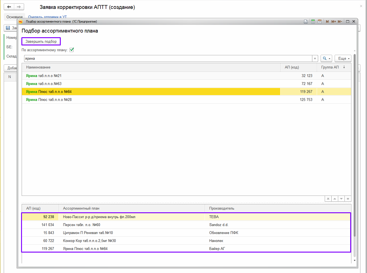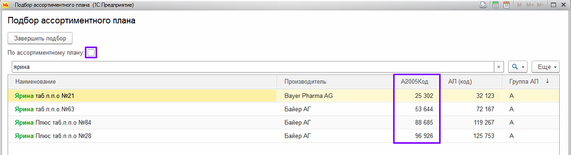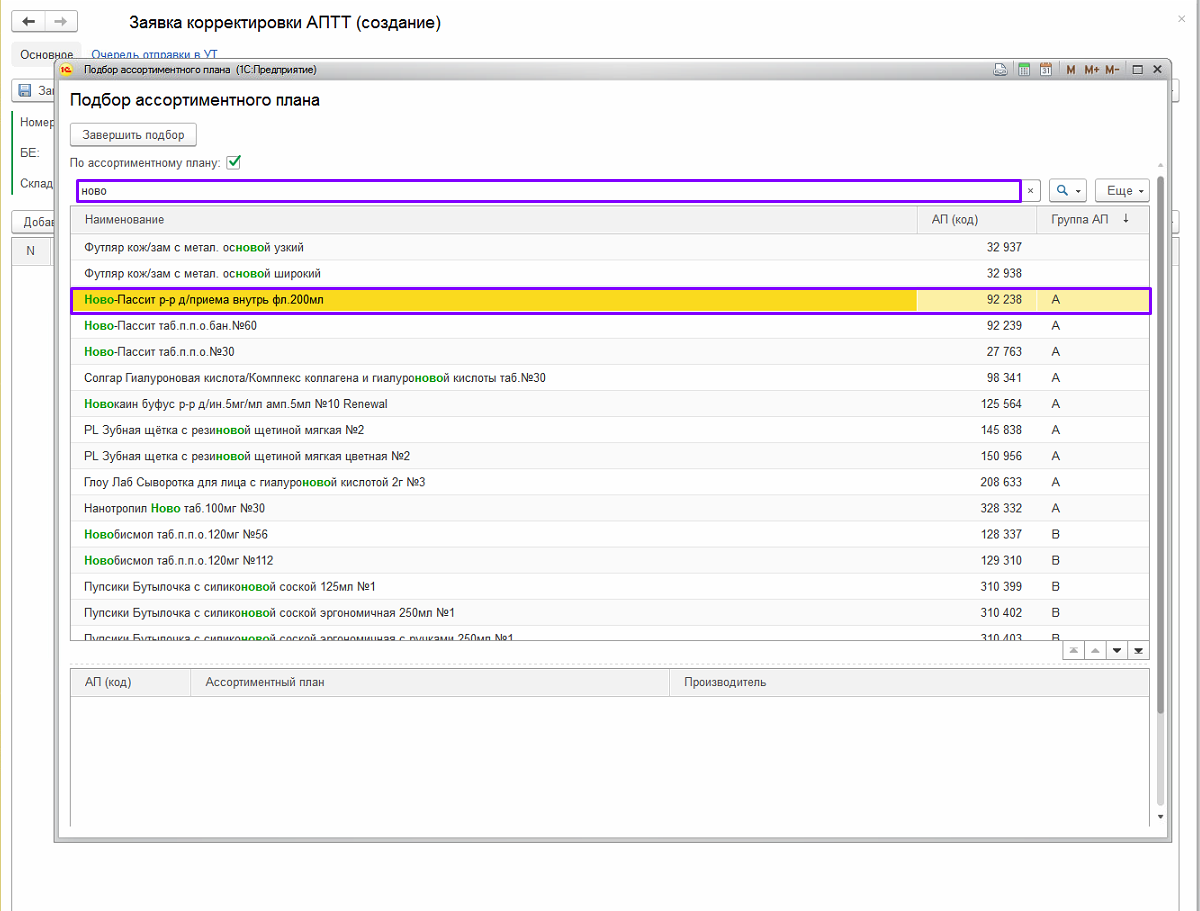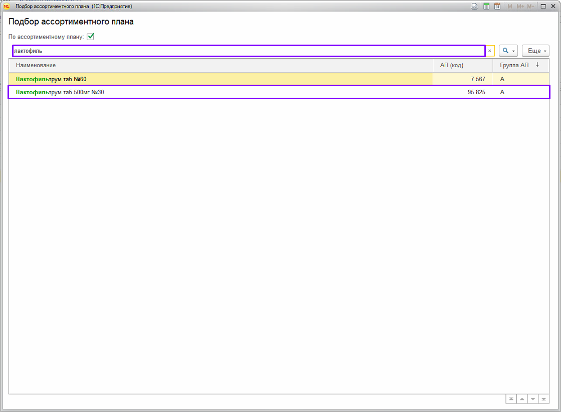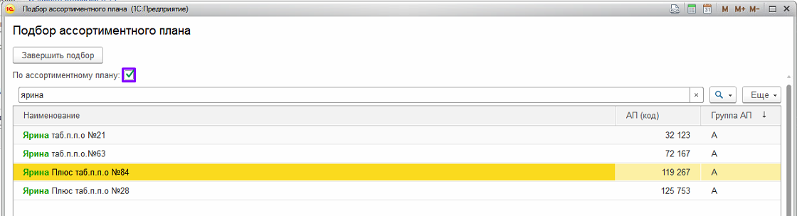 В открывшемся окне подбора в поле поиска введите наименование ассортиментного плана.