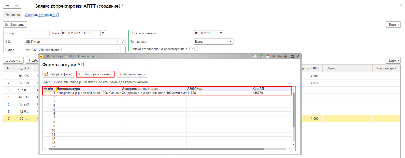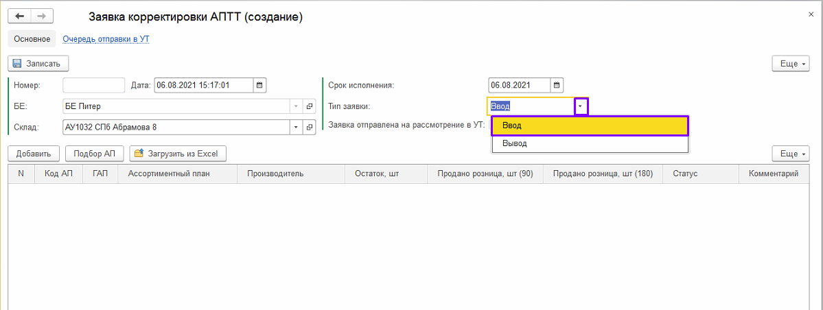 Выберите необходимый вид заявки на корректировку ассортиментного плана: