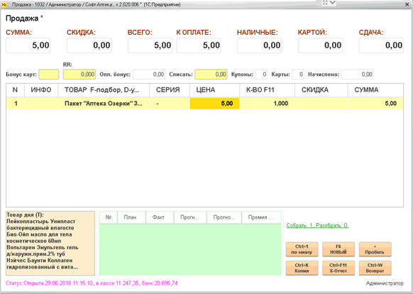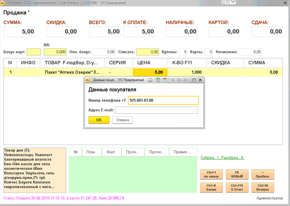 2. Нажимаем комбинацию Ctrl+T, открывается окно, в котором нужно ввести или телефон, или E-mail покупателя. Одновременно и телефон и E-mail вводить нельзя, программа не пропустит. Нажимаем кнопку «ОК». Переходим к оплате, проводим чек, клиент получит СМС на телефон или сообщение на адрес электронной почты. Повторное нажатие сочетания клавиш CTRL+T требуется только для корректировки.