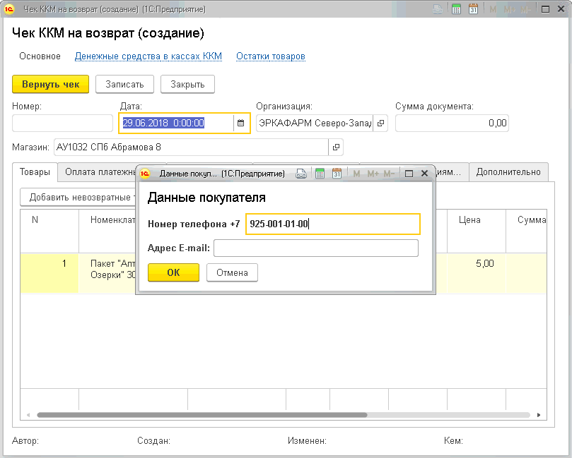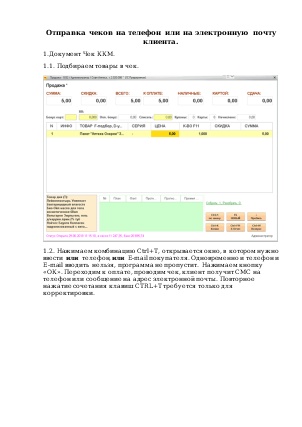 1. Создаем чек на возврат. Нажимаем комбинацию клавиш CTRL+T, в открывшемся окне заполняем или телефон покупателя или адрес электронной почты. Нажимаем кнопку «ОК», нажимаем «Пробить чек», клиент получит СМС или сообщение на почту.