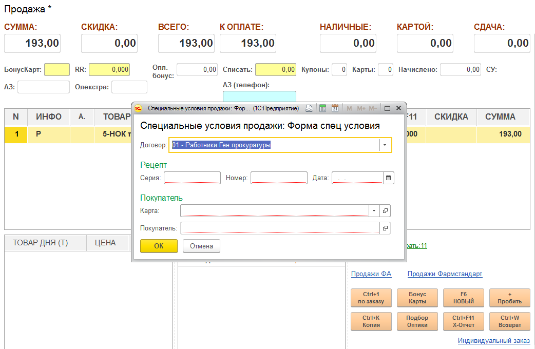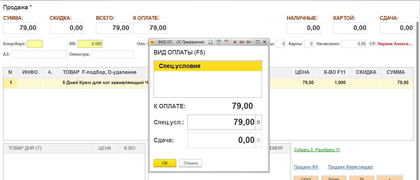 4. При нажатии на кнопку «Пробить» появляется окно выбора типа оплаты, где можно выбрать только «Спец. условия».