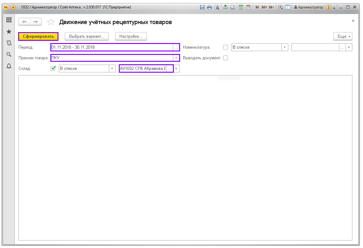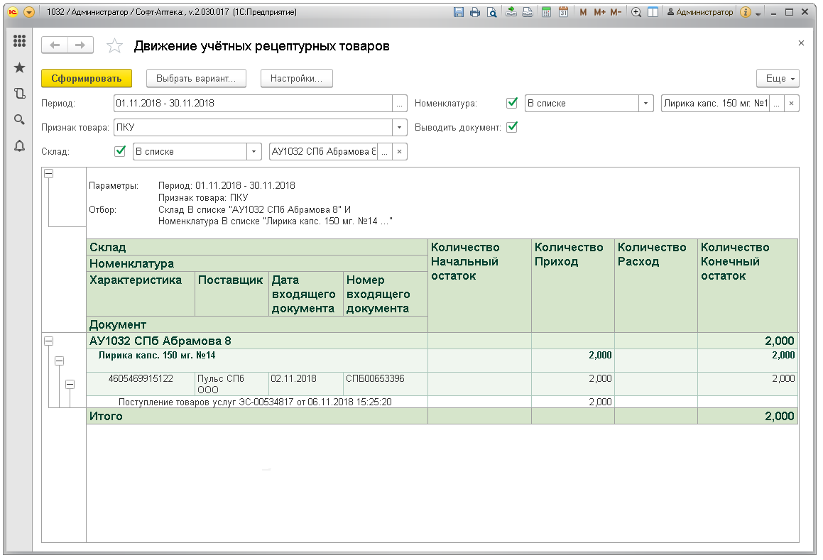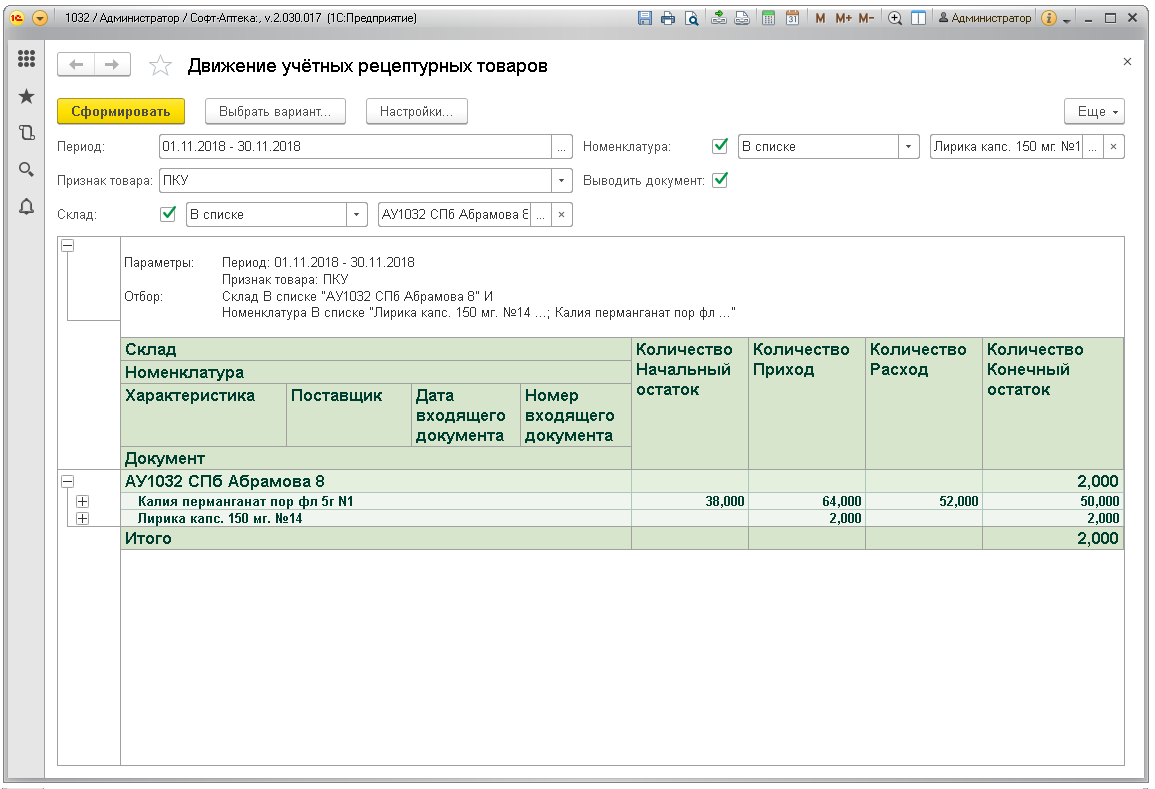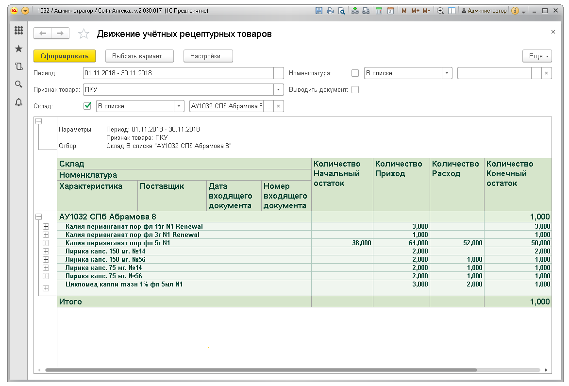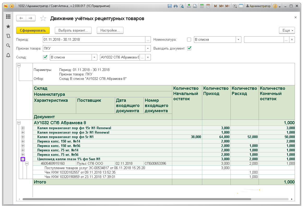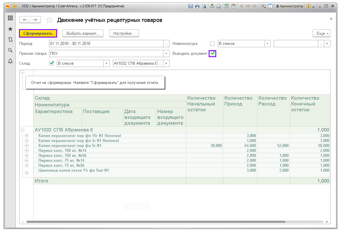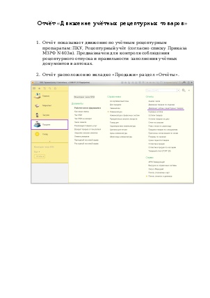 Отчёт показывает движение по учётным рецептурным препаратам: ПКУ, Рецептурный учёт (согласно списку Приказа МЗРФ N403н). Предназначен для контроля соблюдения рецептурного отпуска и правильности заполнения учётных документов в аптеках.