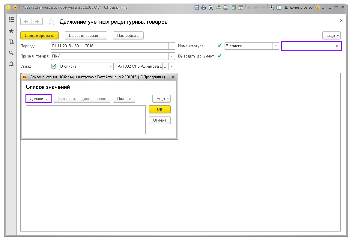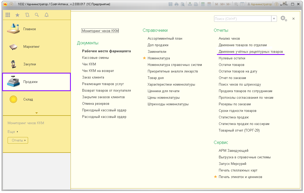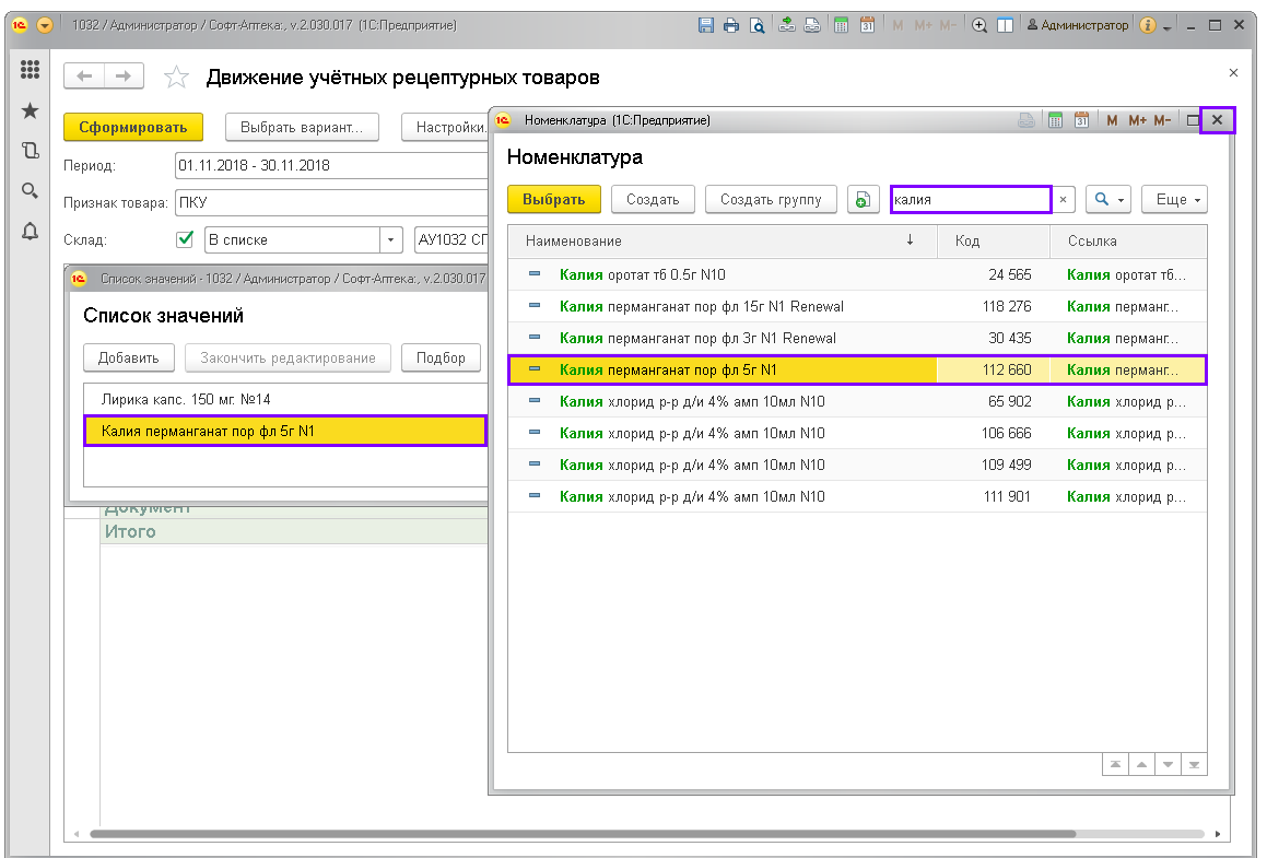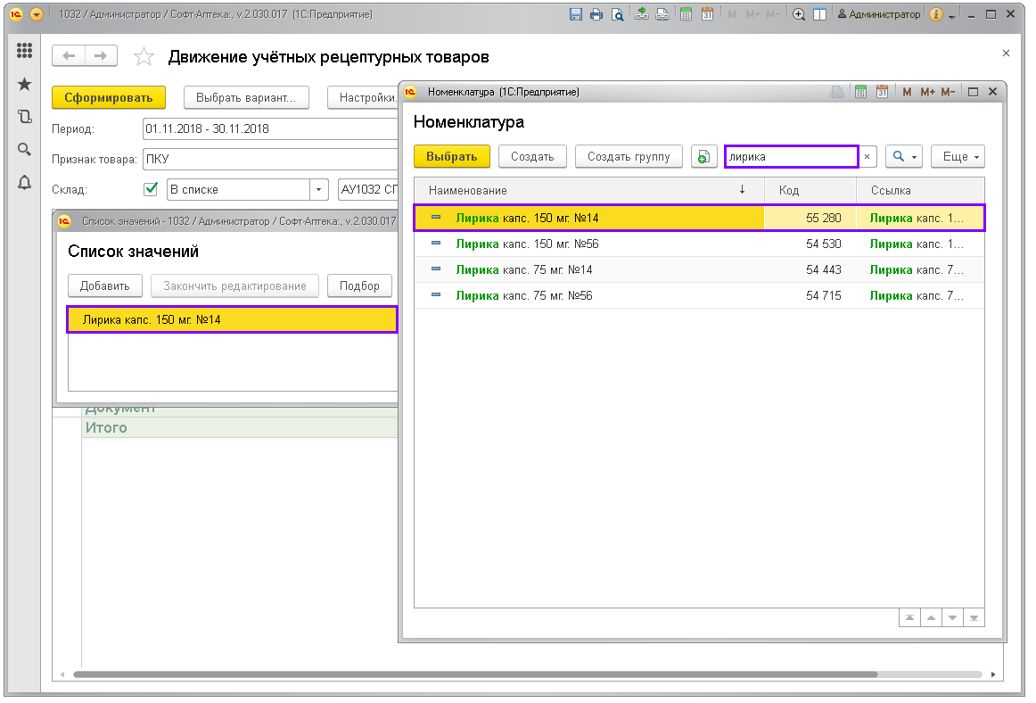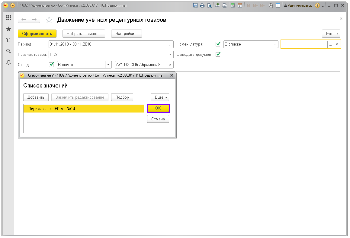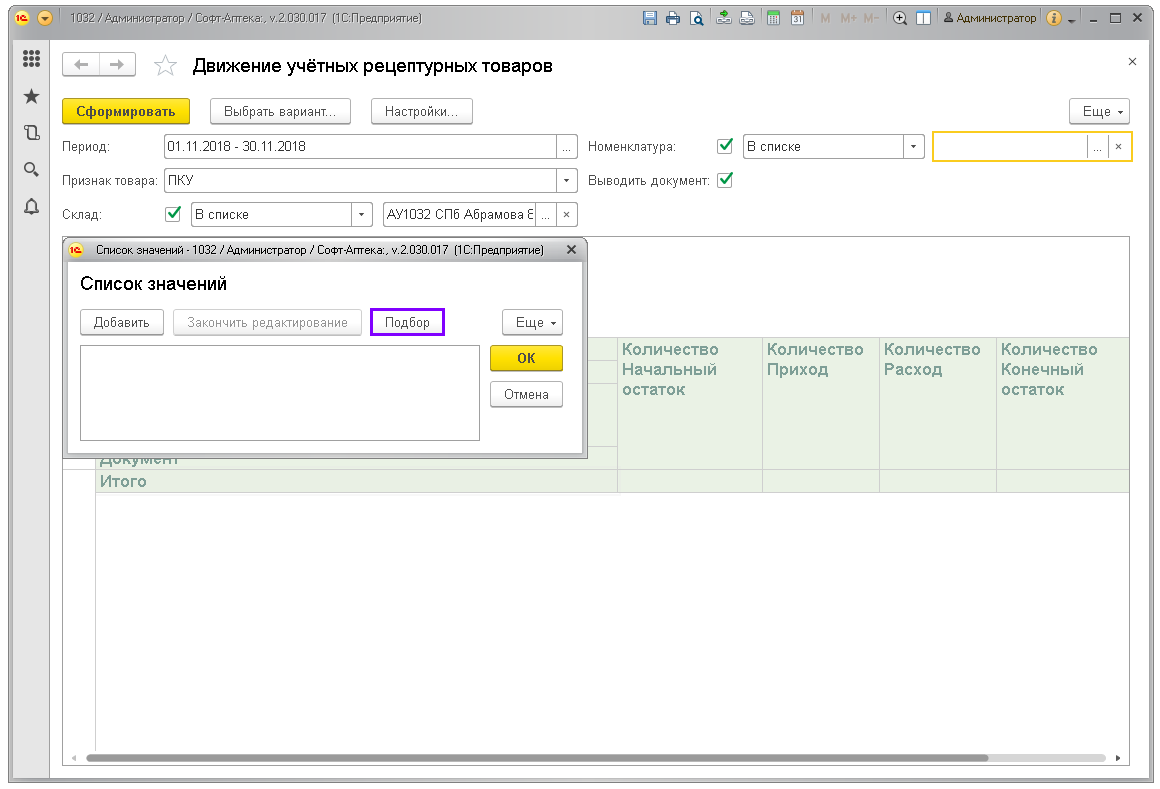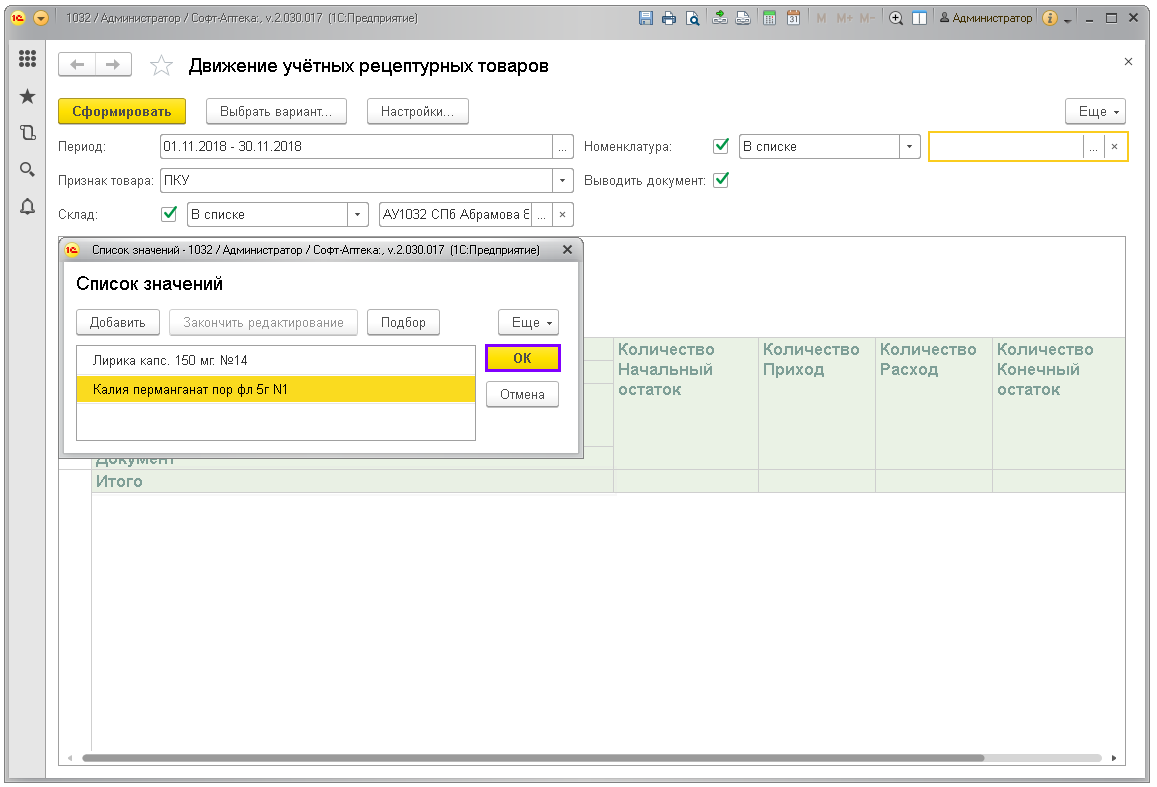 Отчёт показывает движение по учётным рецептурным препаратам: ПКУ, Рецептурный учёт (согласно списку Приказа МЗРФ N403н). Предназначен для контроля соблюдения рецептурного отпуска и правильности заполнения учётных документов в аптеках.