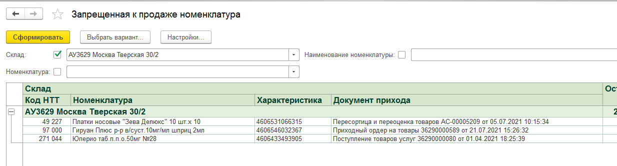 Пример отчёта, сформированного по складу «АУ3629 Москва Тверская 30/2».