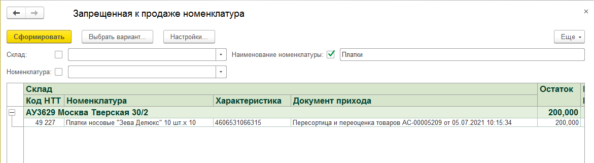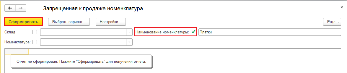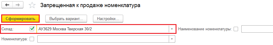 2. Для просмотра списка запрещённых к продаже номенклатур необходимо выбрать склад. Нажмите кнопку «Сформировать» для построения отчёта.
