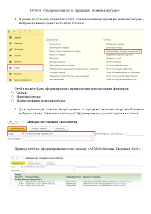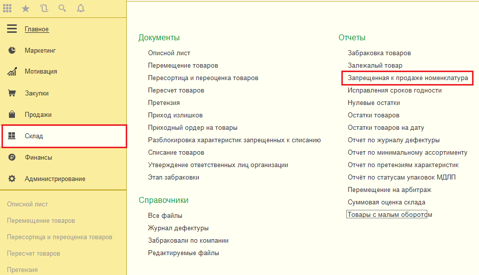 - В разделе «Склад» откройте отчёт «Запрещенная к продаже номенклатура», выбрав нужный пункт в столбце Отчёты.