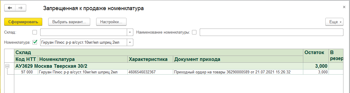 Пример отчёта, сформированного по номенклатуре «Гируан Плюс р-р в/суст.10мг/мл шприц 2мл»