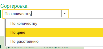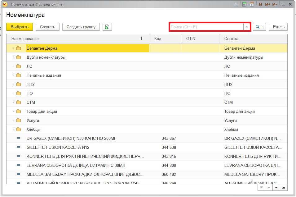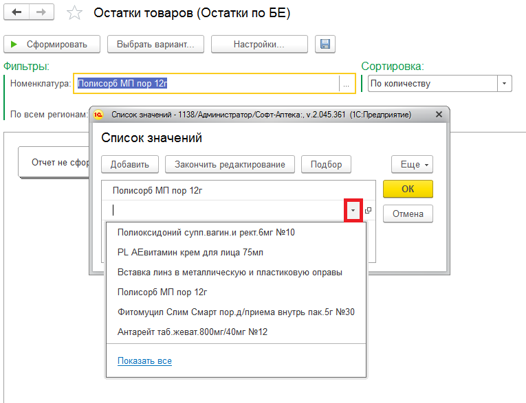 При подборе номенклатуры открывается весь список доступных номенклатур, для удобства можно воспользоваться поиском.