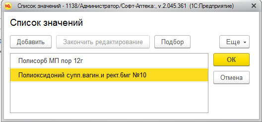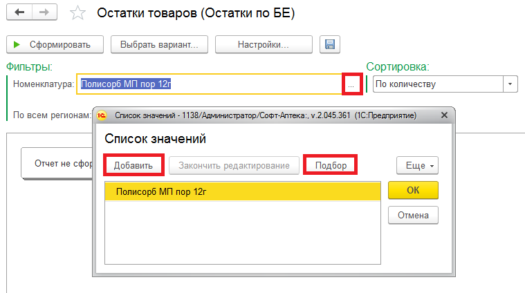 Для добавления номенклатуры нажмите «…». Название номенклатуры можно занести в список при помощи кнопок «Добавить» и «Подбор».