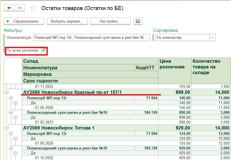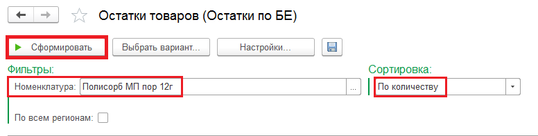 Если необходимо посмотреть остатки товаров по всем регионам, то устанавливаем галочку в фильтре «По всем регионам».