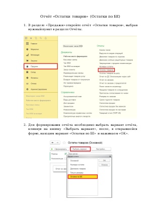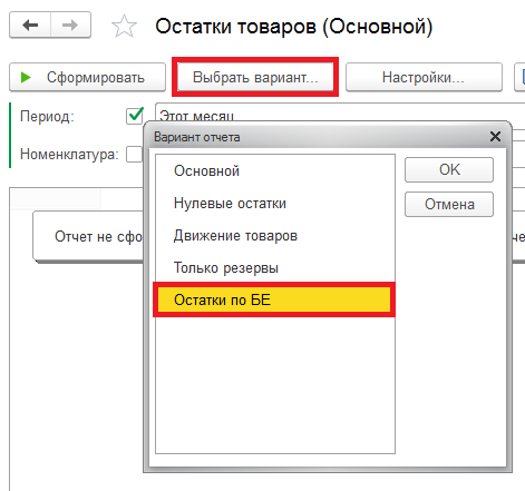 Для формирования отчёта необходимо выбрать вариант отчёта, кликнув на кнопку «Выбрать вариант», после, в открывшейся форме, находим вариант «Остатки по БЕ» и нажимаем «ОК».