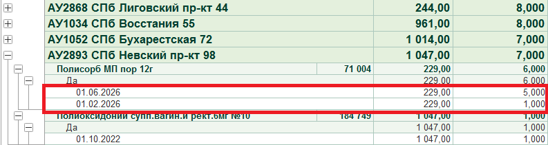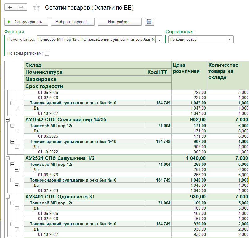 В отчёте отражена информация о месте нахождения товара, его розничной цене, сроке годности и количестве на складе. Если указано 2 строки, то это означает, что товар есть в разных сериях.