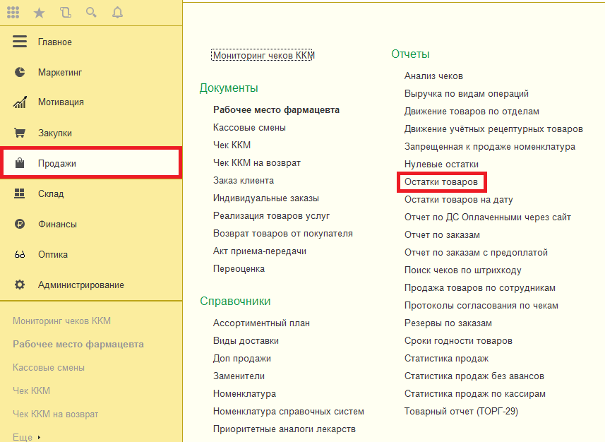 В разделе «Продажи» откройте отчёт «Остатки товаров», выбрав нужный пункт в разделе Отчёты.