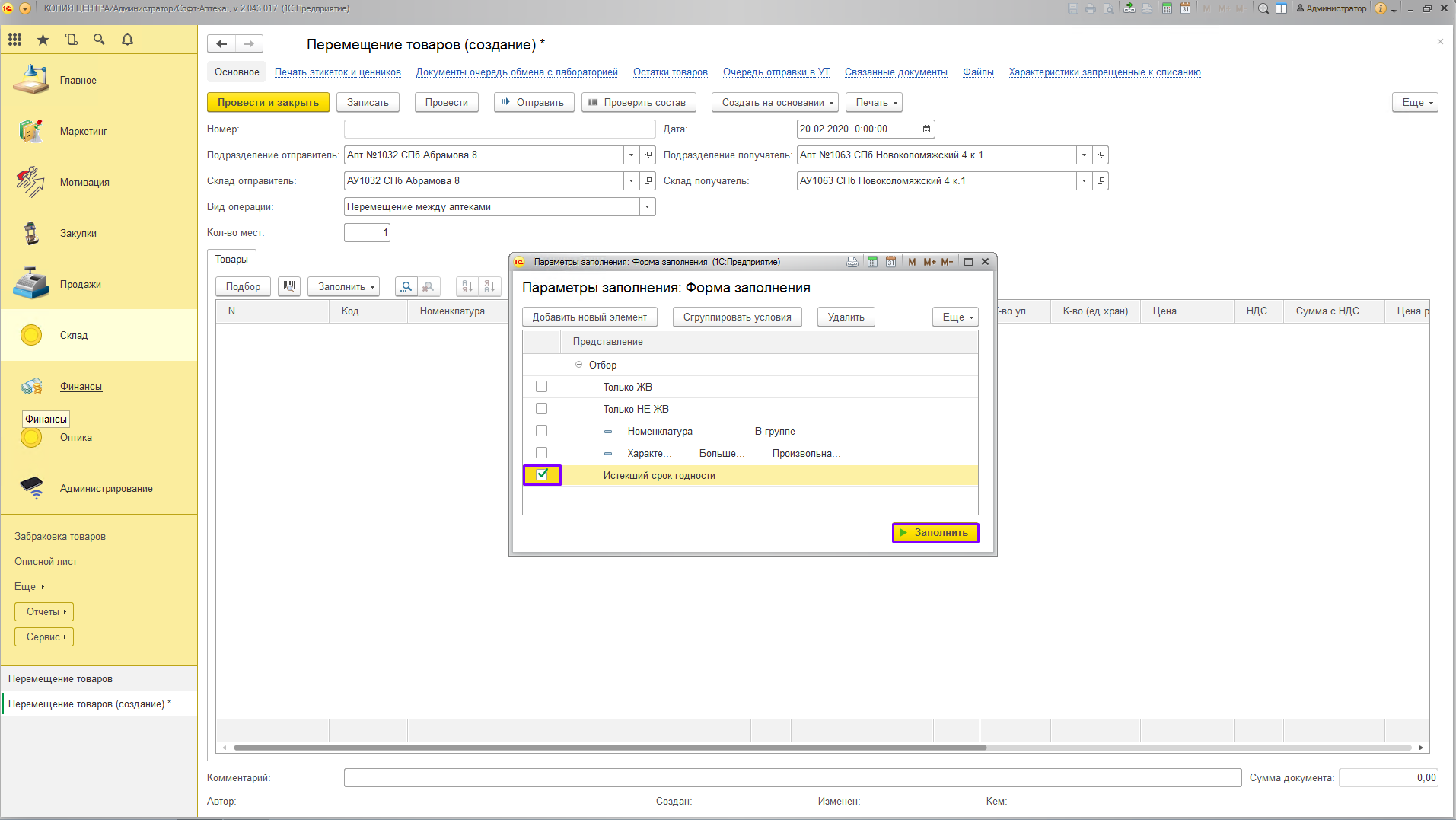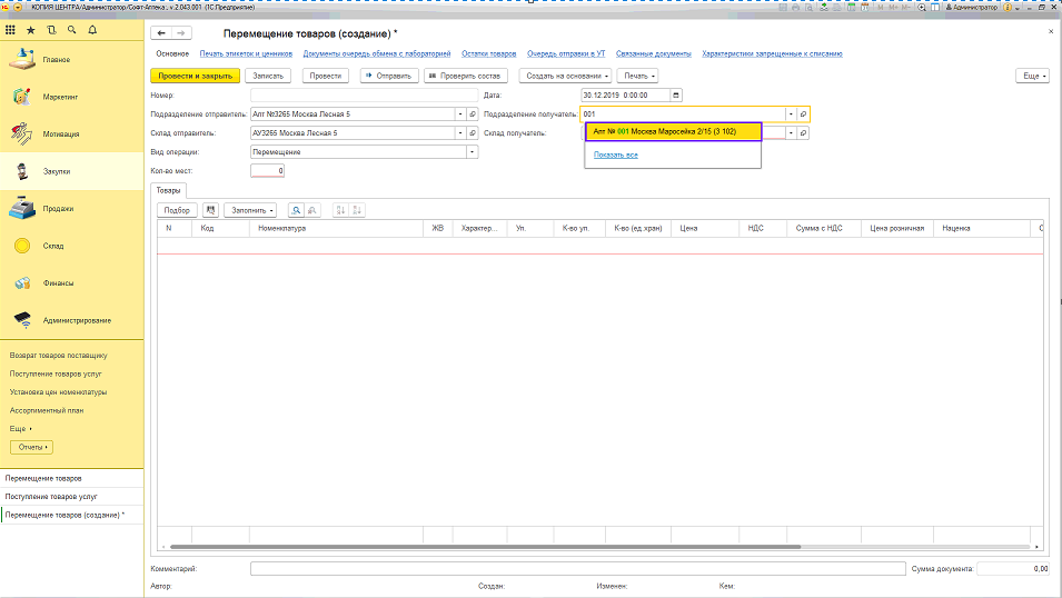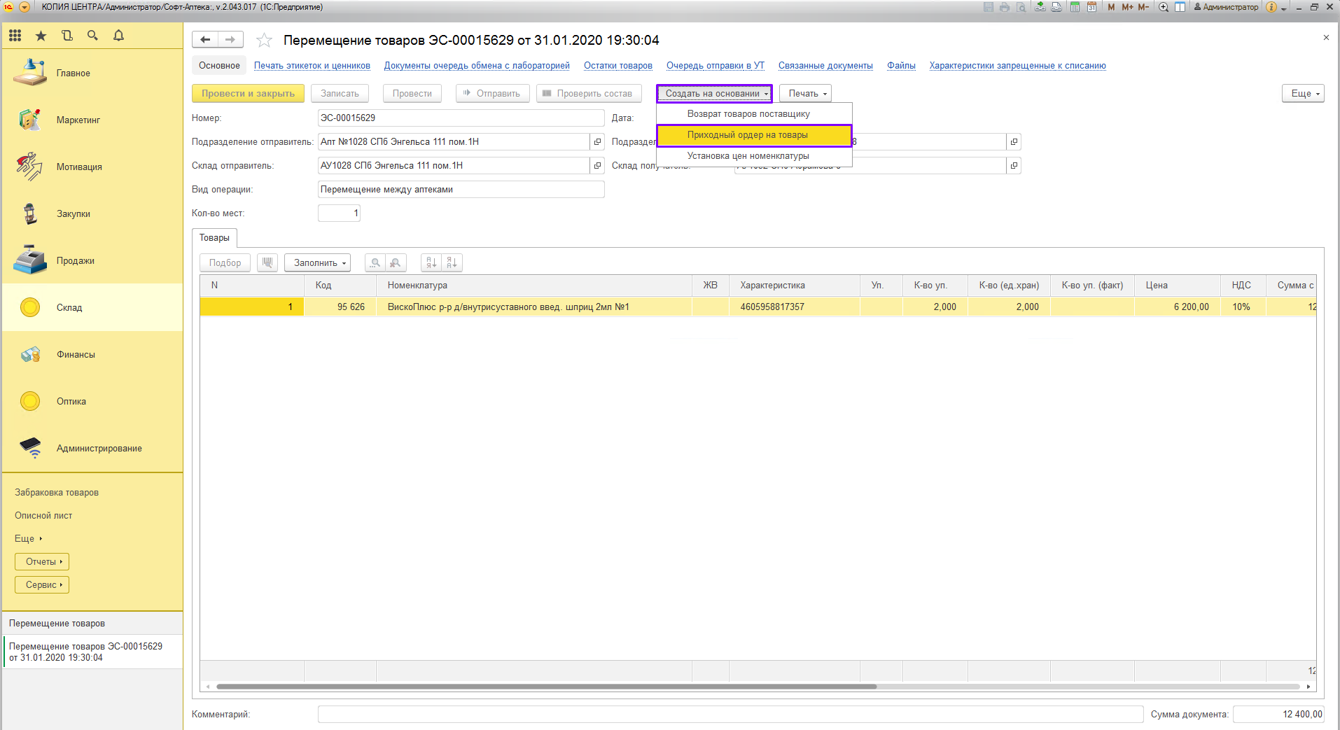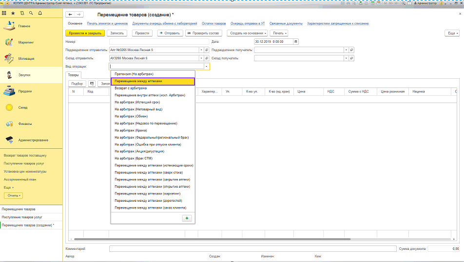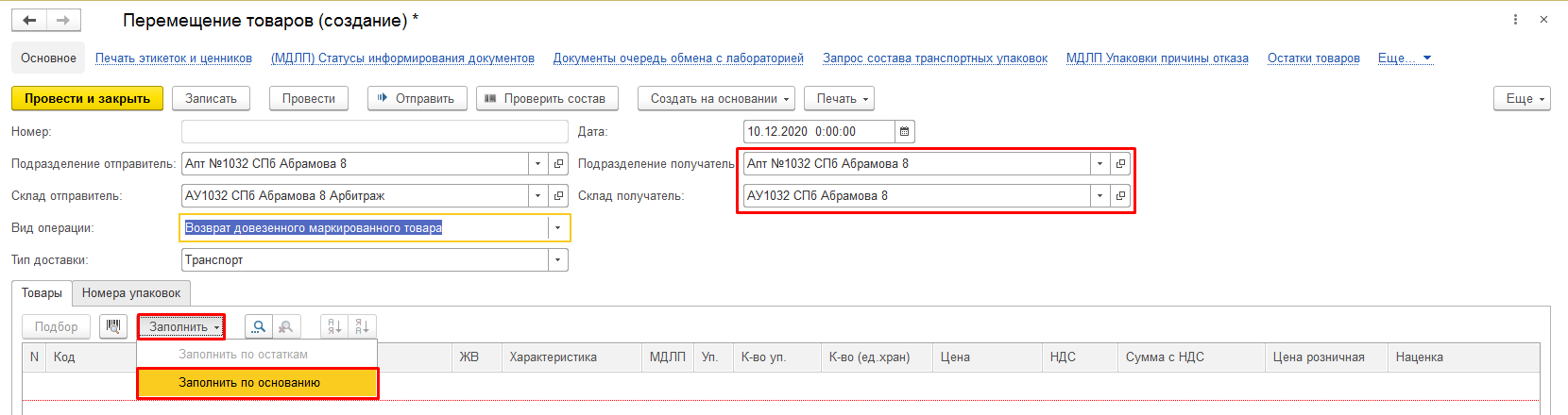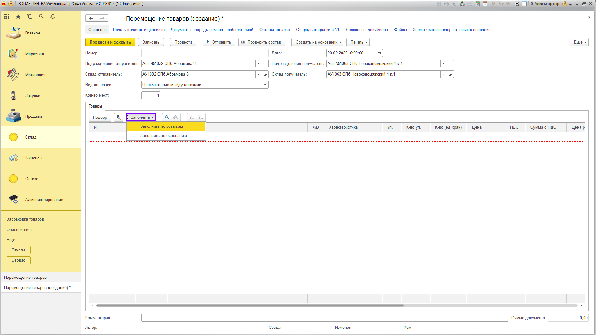 Создание документа перемещения товара со склада Арбитраж на Основной склад аптеки по довезенному товару