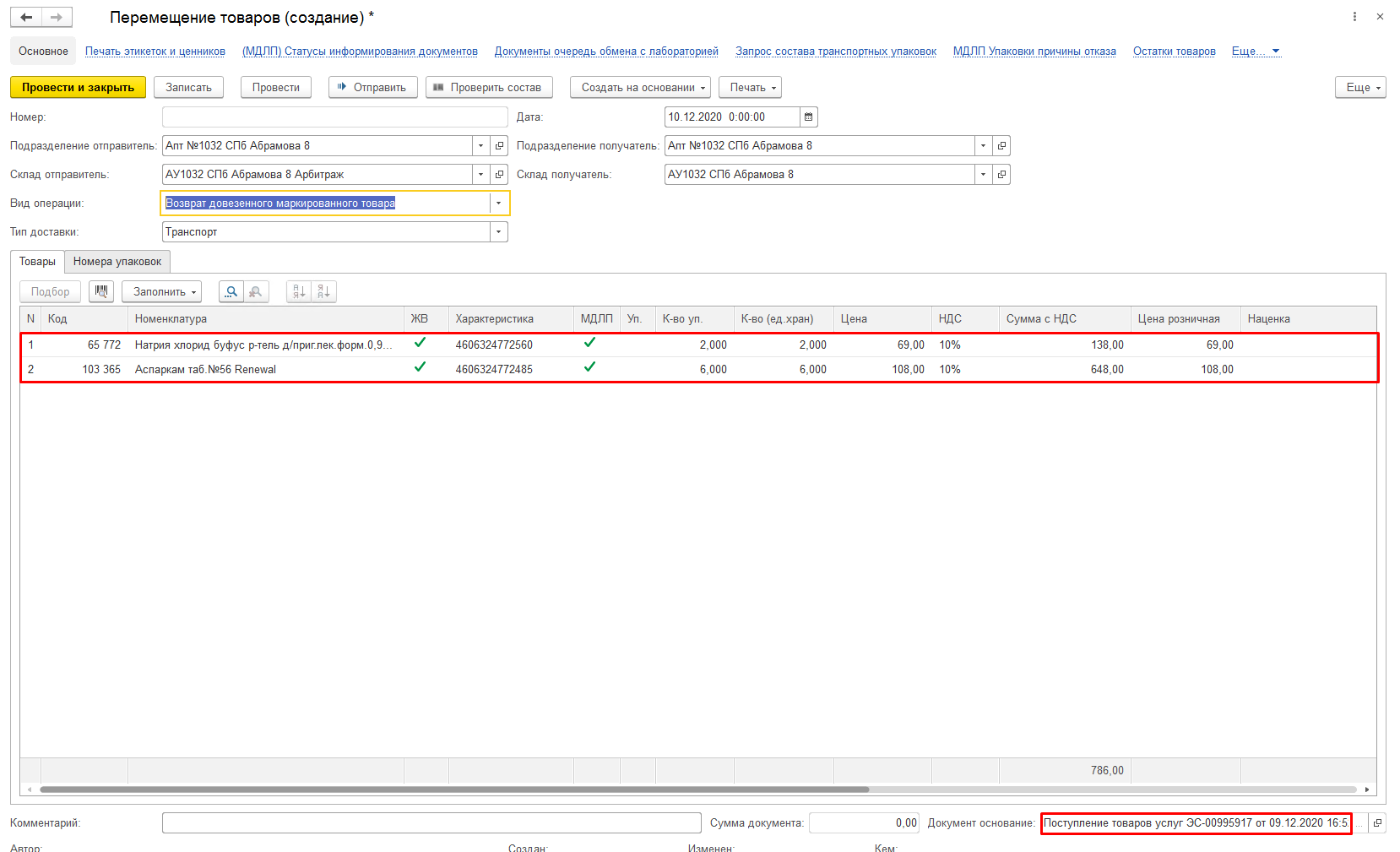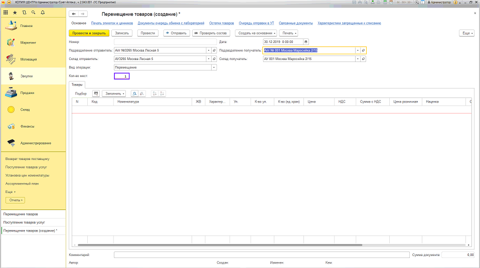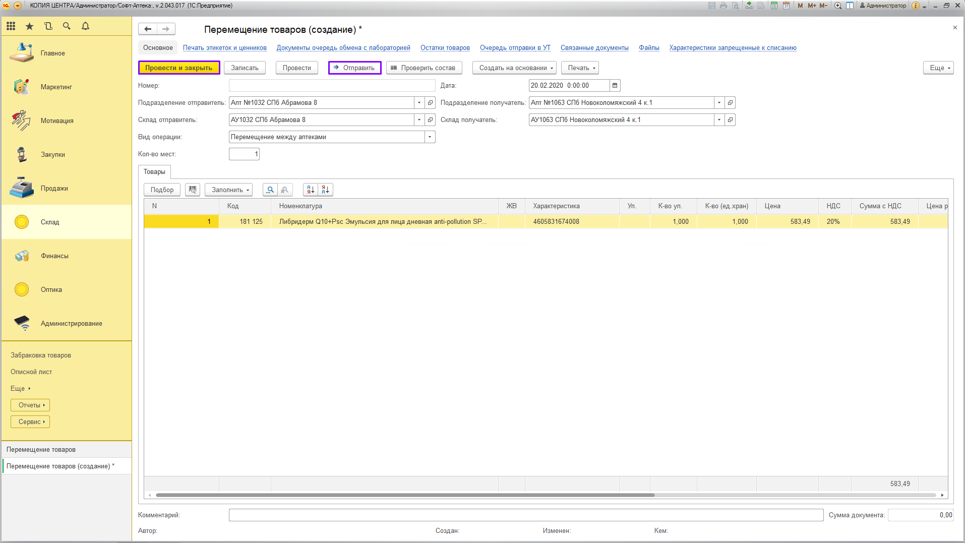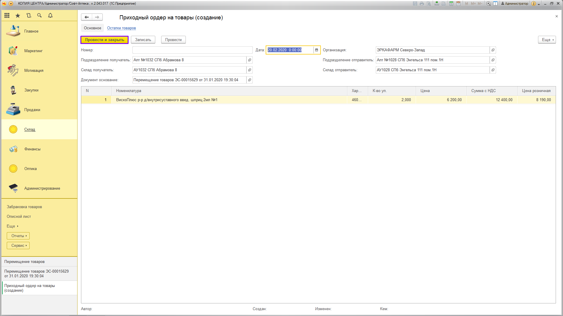 Для завершения операции перемещения товаров между складами нажмите на кнопку «Провести и закрыть». В этот момент товар по документу оприходуется на склад аптеки-получателя.