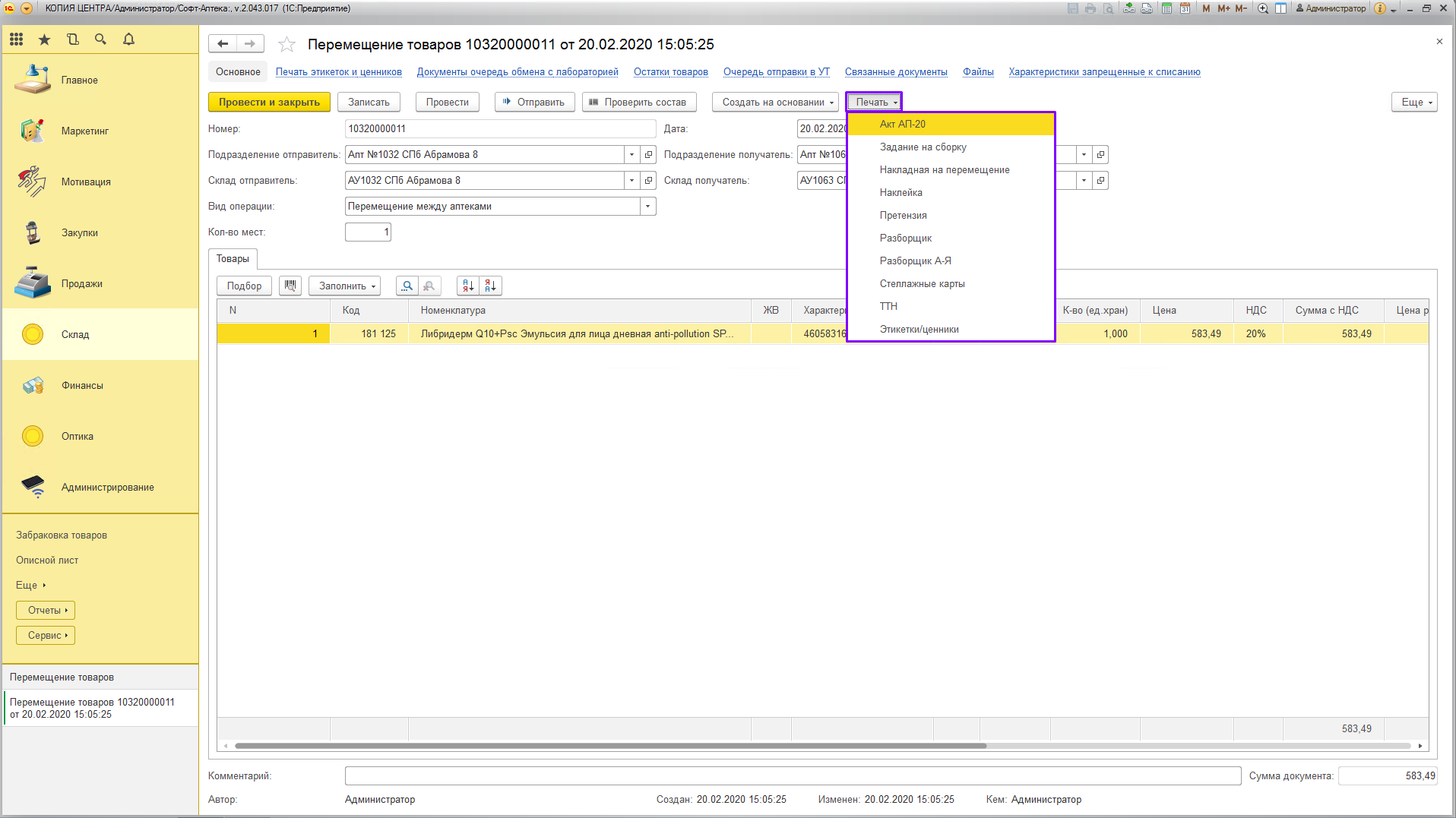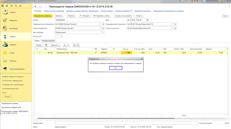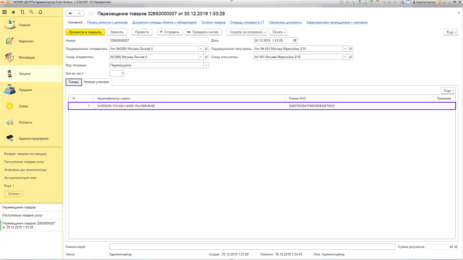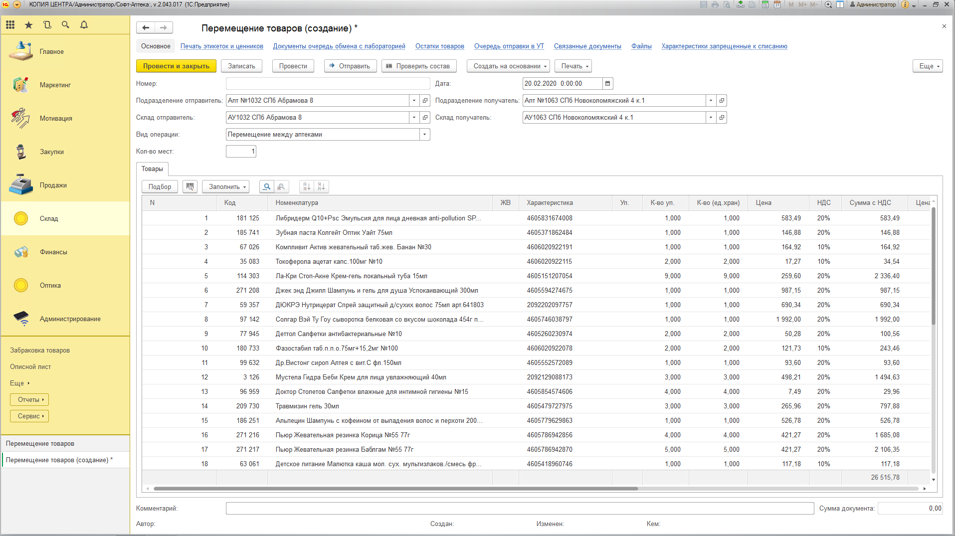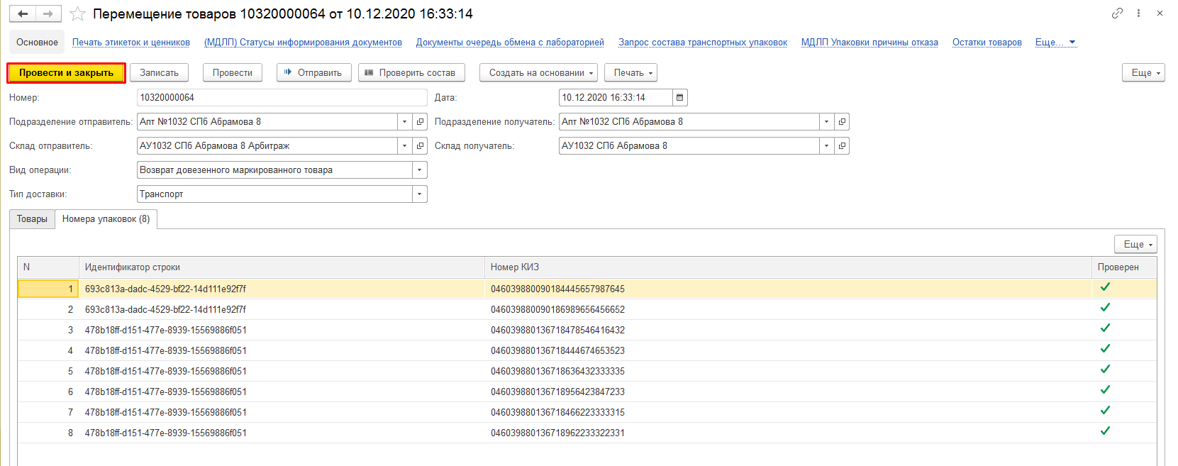 Для завершения операции перемещения товаров между складами нажмите на кнопку «Провести и закрыть». В этот момент товар по документу оприходуется на склад аптеки-получателя.