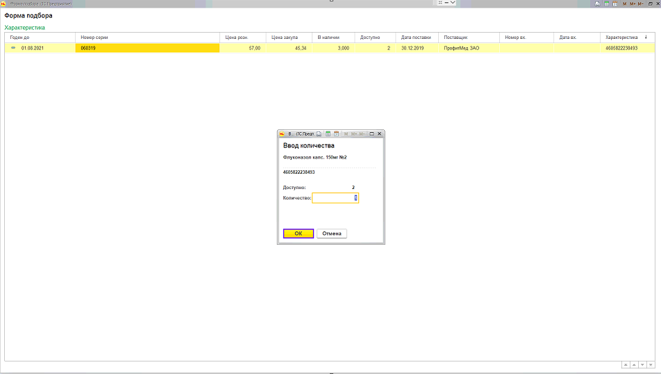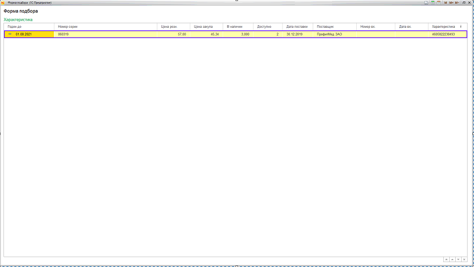 Нажмите кнопку «Подбор». В открывшейся форме подбора наберите интересующую номенклатуру и с помощью клавиши Enter «провалитесь» в меню выбора партий.