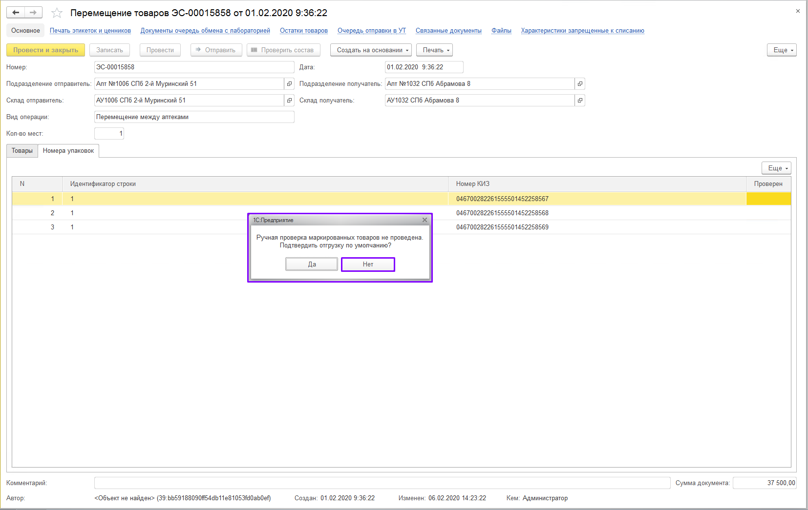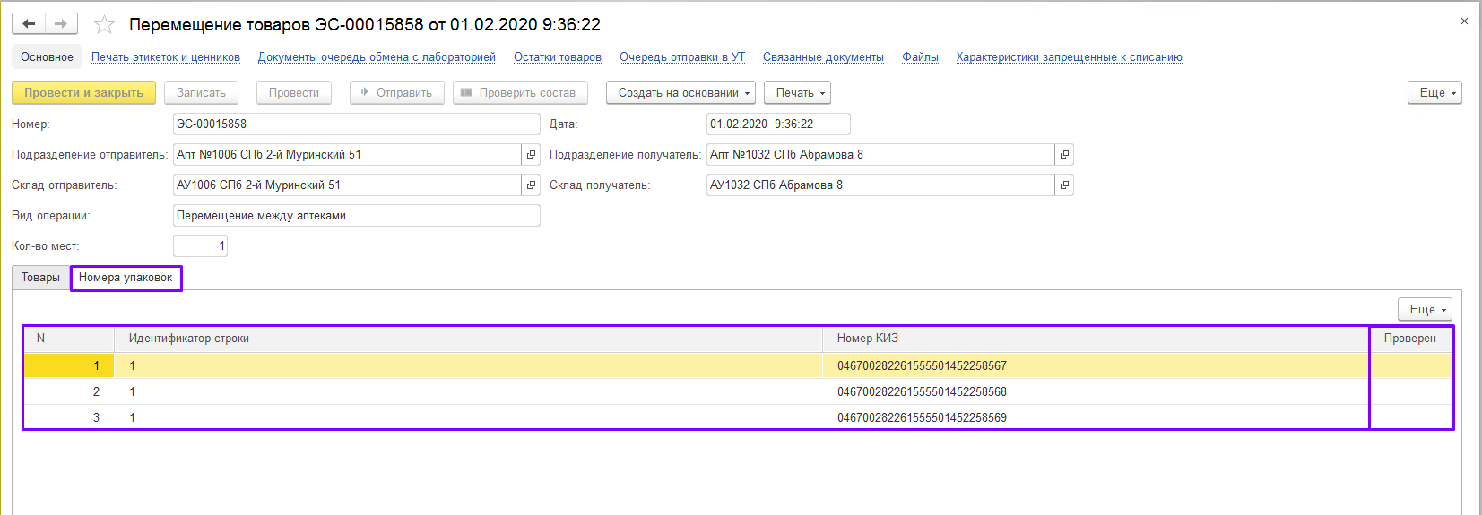 Откройте документ перемещения и перейдите во вкладку «Номера упаковок», здесь будет отражена информация по маркированным товарам. В столбце «Проверен» пусто — это значит, что проверка не произведена.