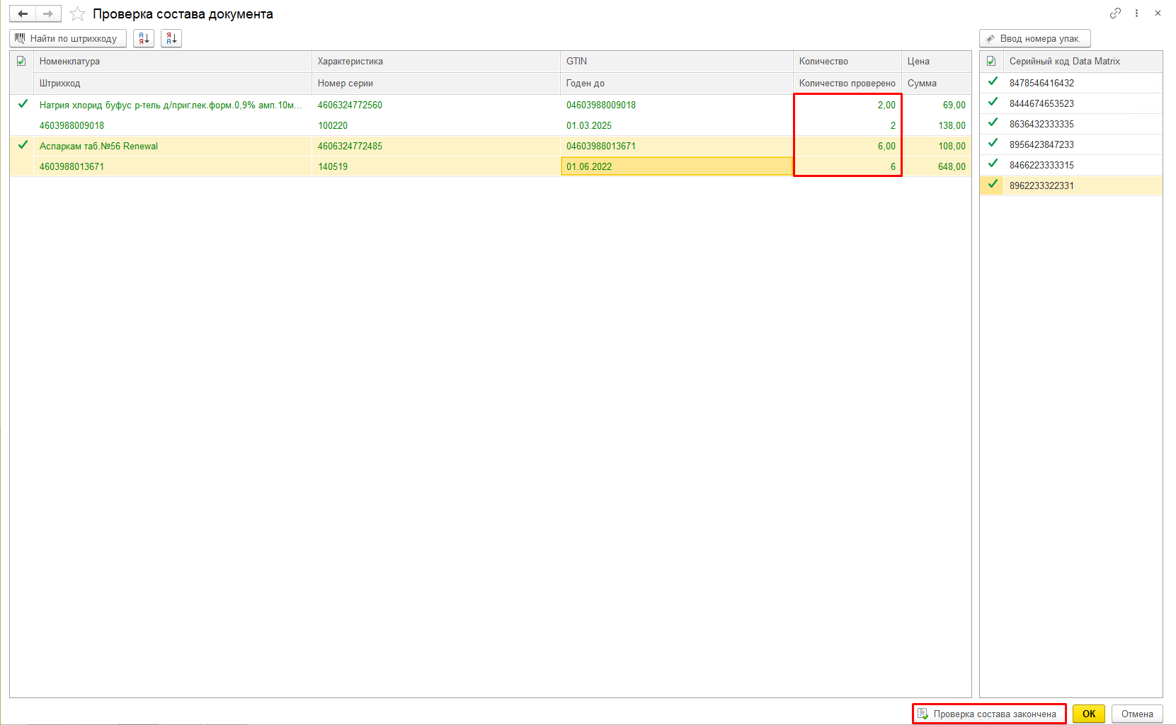Товары будут подсвечены зеленым цветом. Нажмите кнопку «Проверка состава закончена».