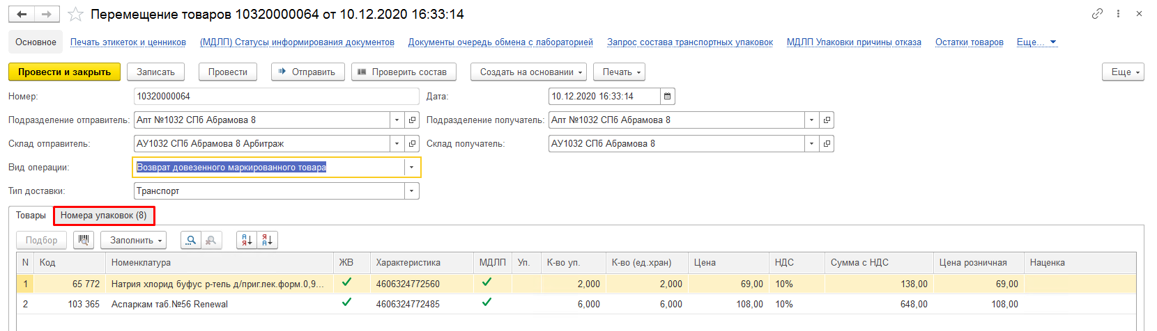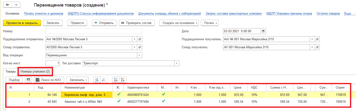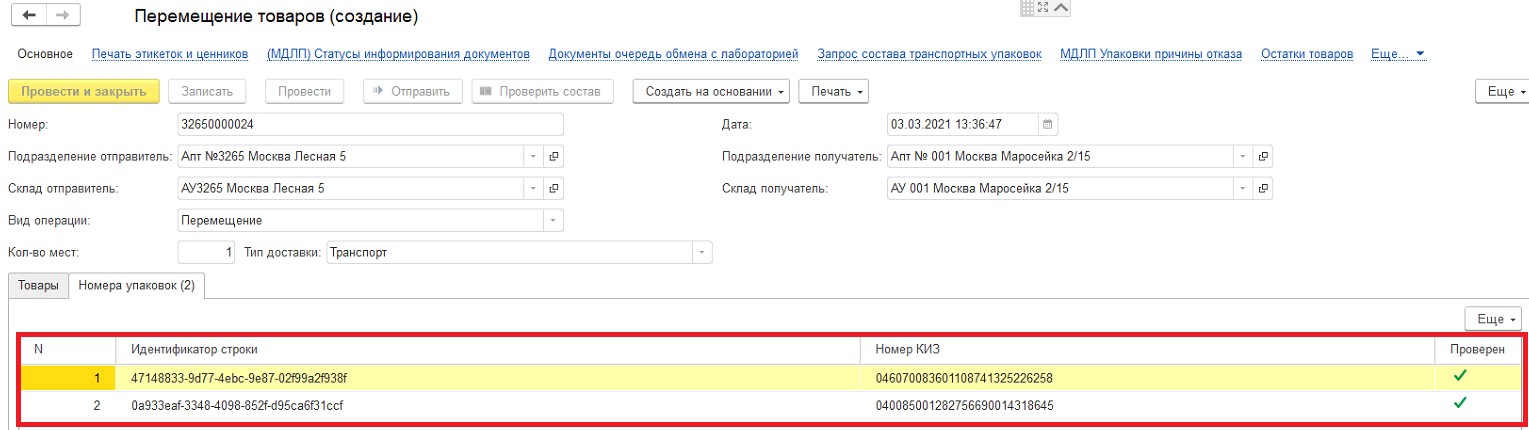 Во вкладке "Номера упаковок" также заполнится информация о перемещаемом маркированном товаре.