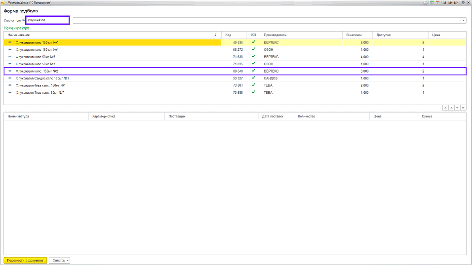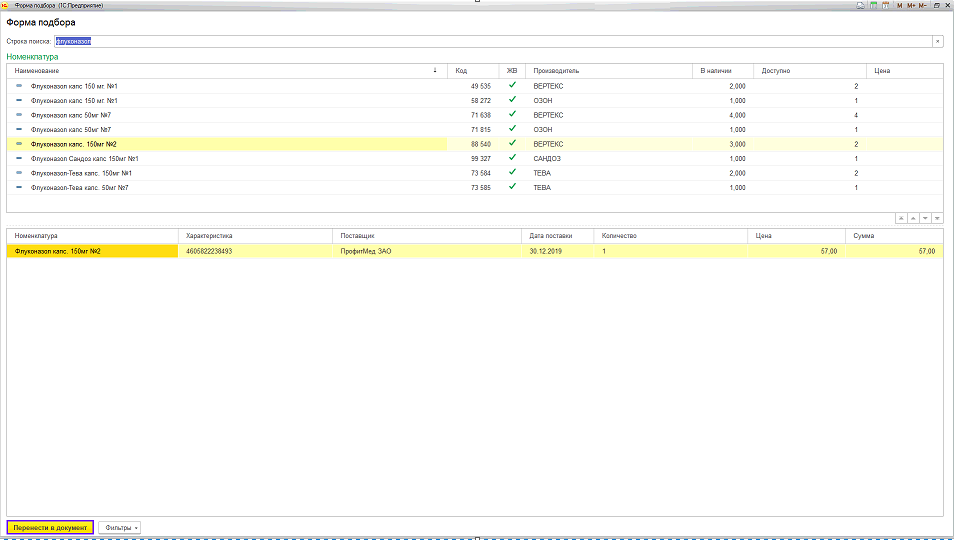 Перенесите выбранную номенклатуру в необходимом количестве в документ с помощью кнопки «Перенести в документ». Данное действие необходимо выполнять единожды после добавления всех позиций для перемещения.