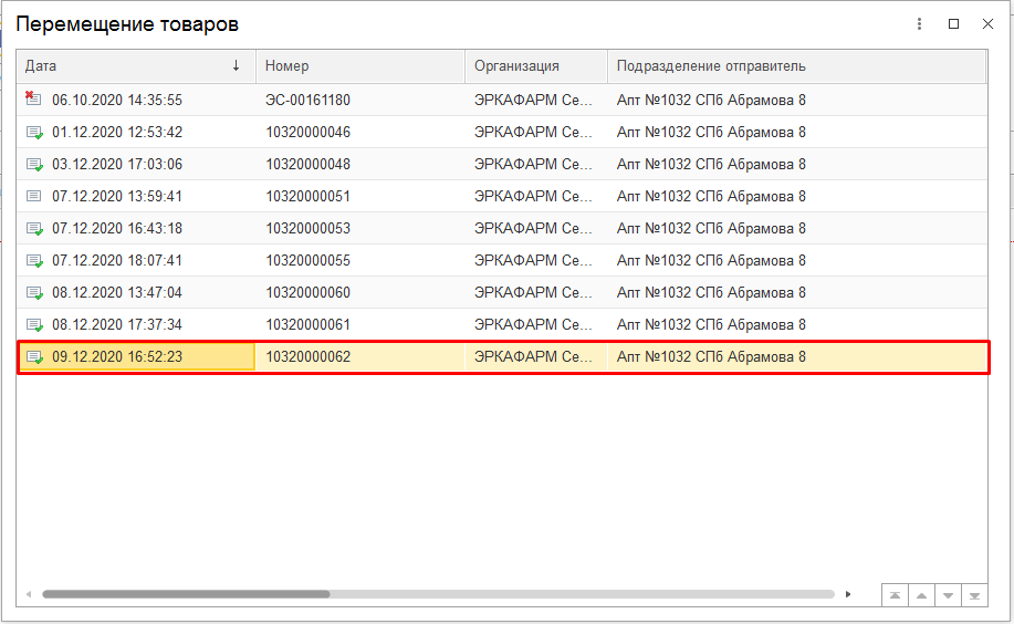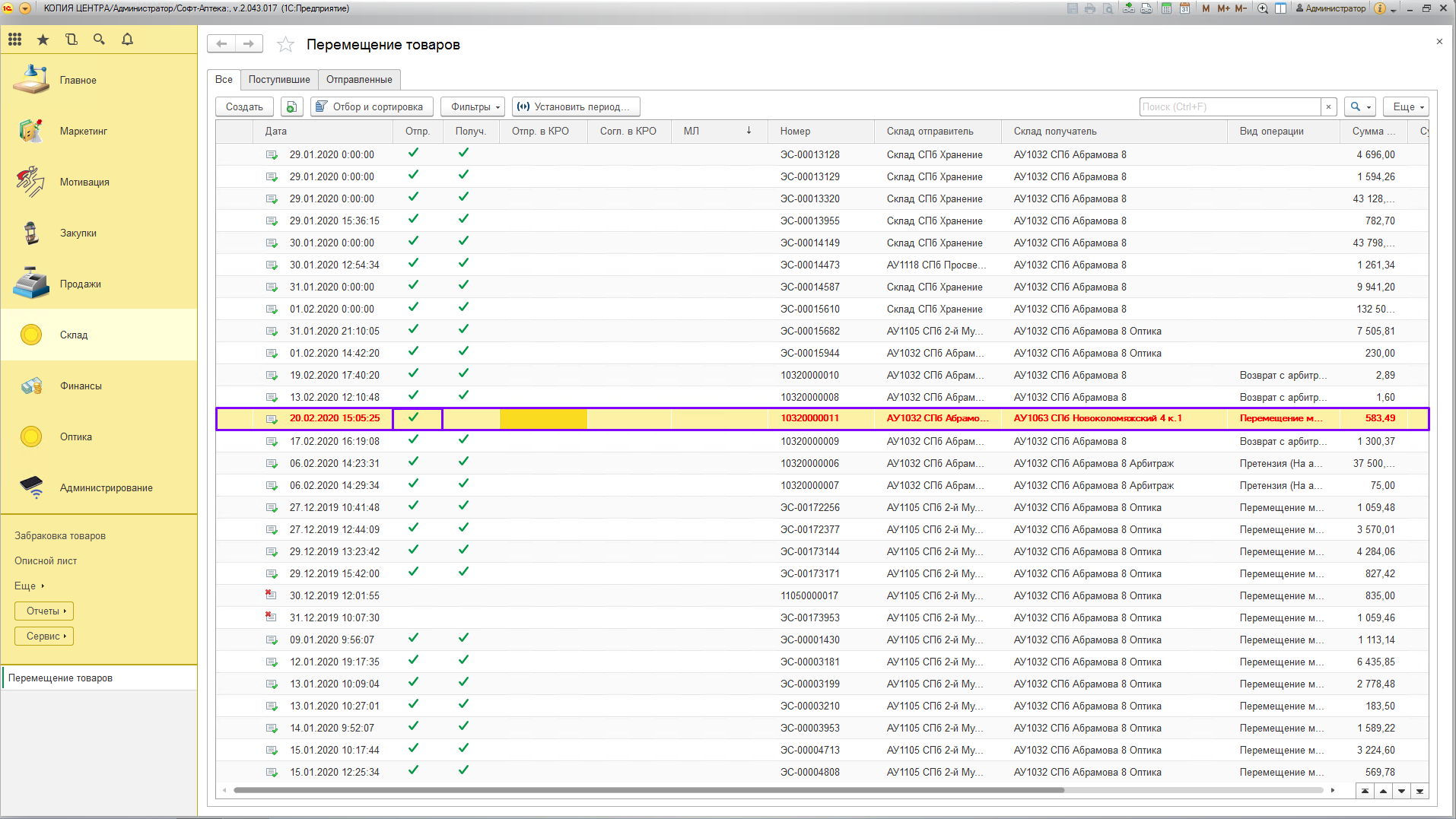 Аптека-получатель и аптека-отправитель будут видеть документ перемещения, подсвеченный красным цветом и с зеленой галкой в столбце «Отправлено». Красное окрашивание шрифта уйдёт после того, как аптека-получатель примет документ. Документ перемещения в аптеке-получателя появится в течение 15 минут.