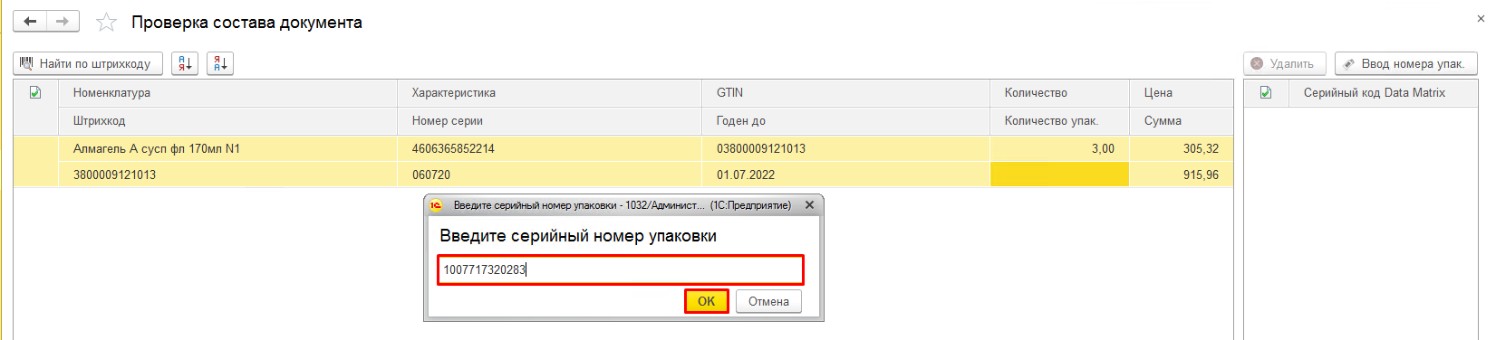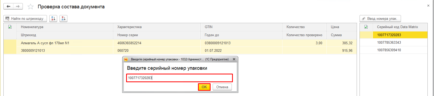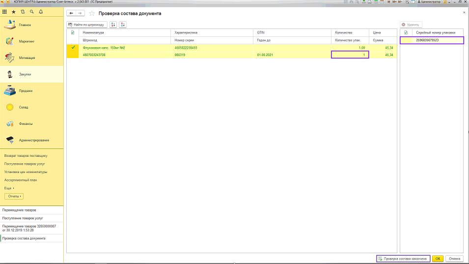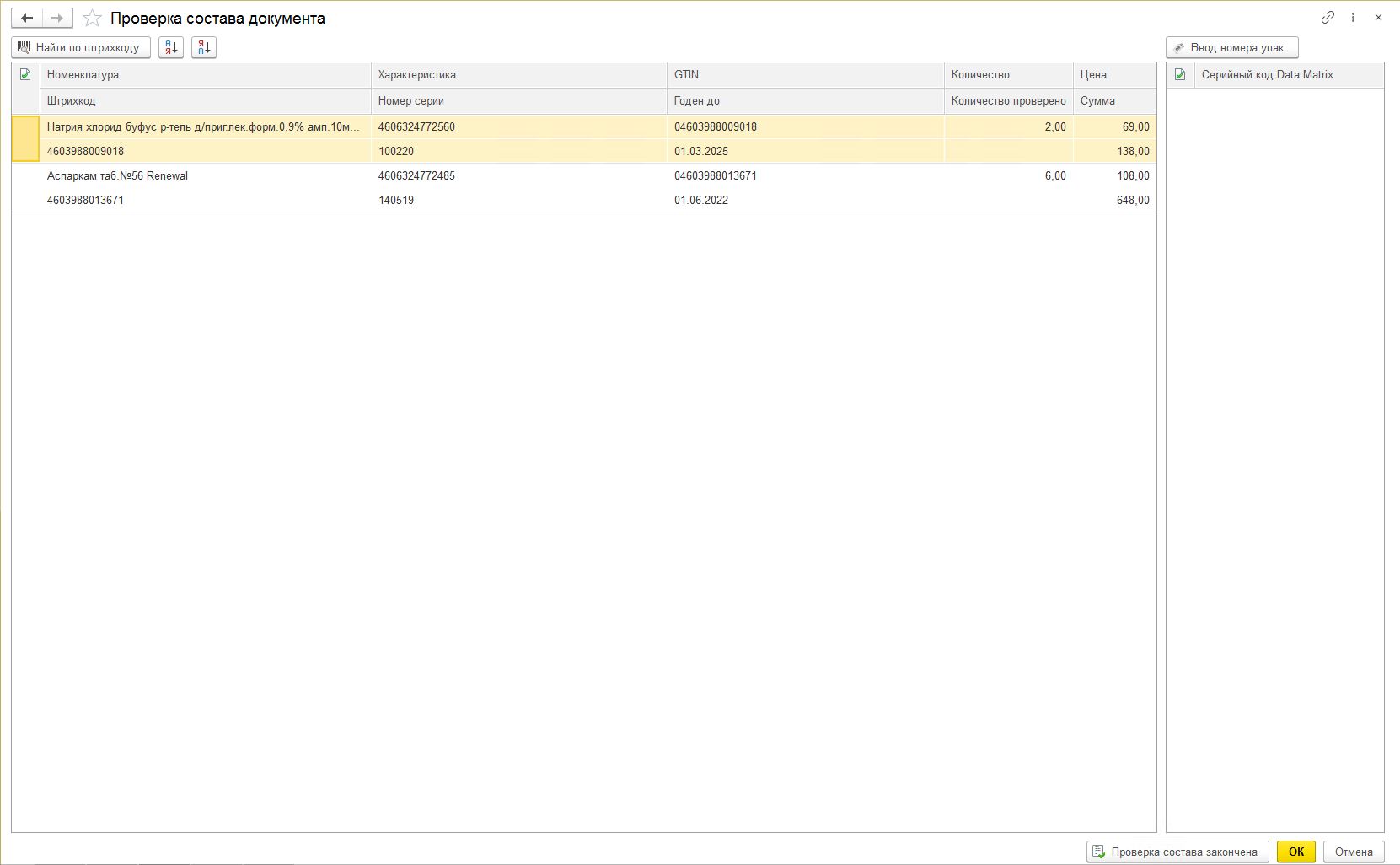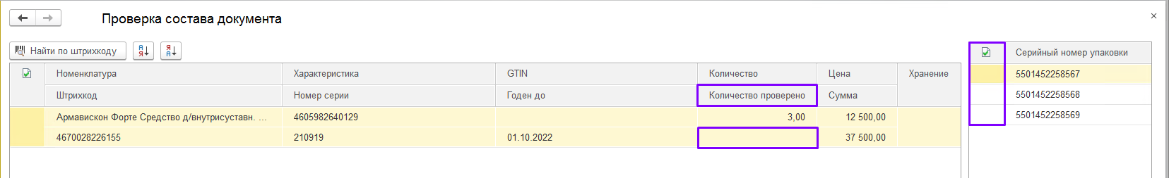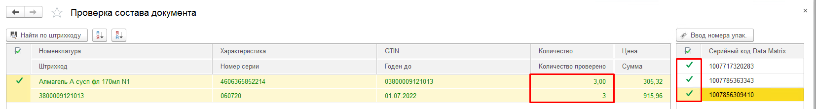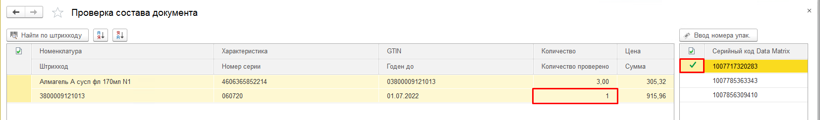 После ввода серийного номера будет проставлена галка проверки, так же в поле «Количество проверено» будет указано количество введенных упаковок.