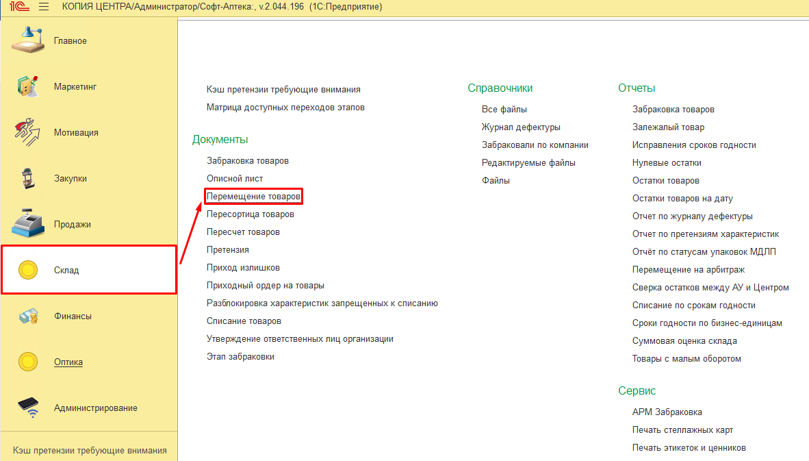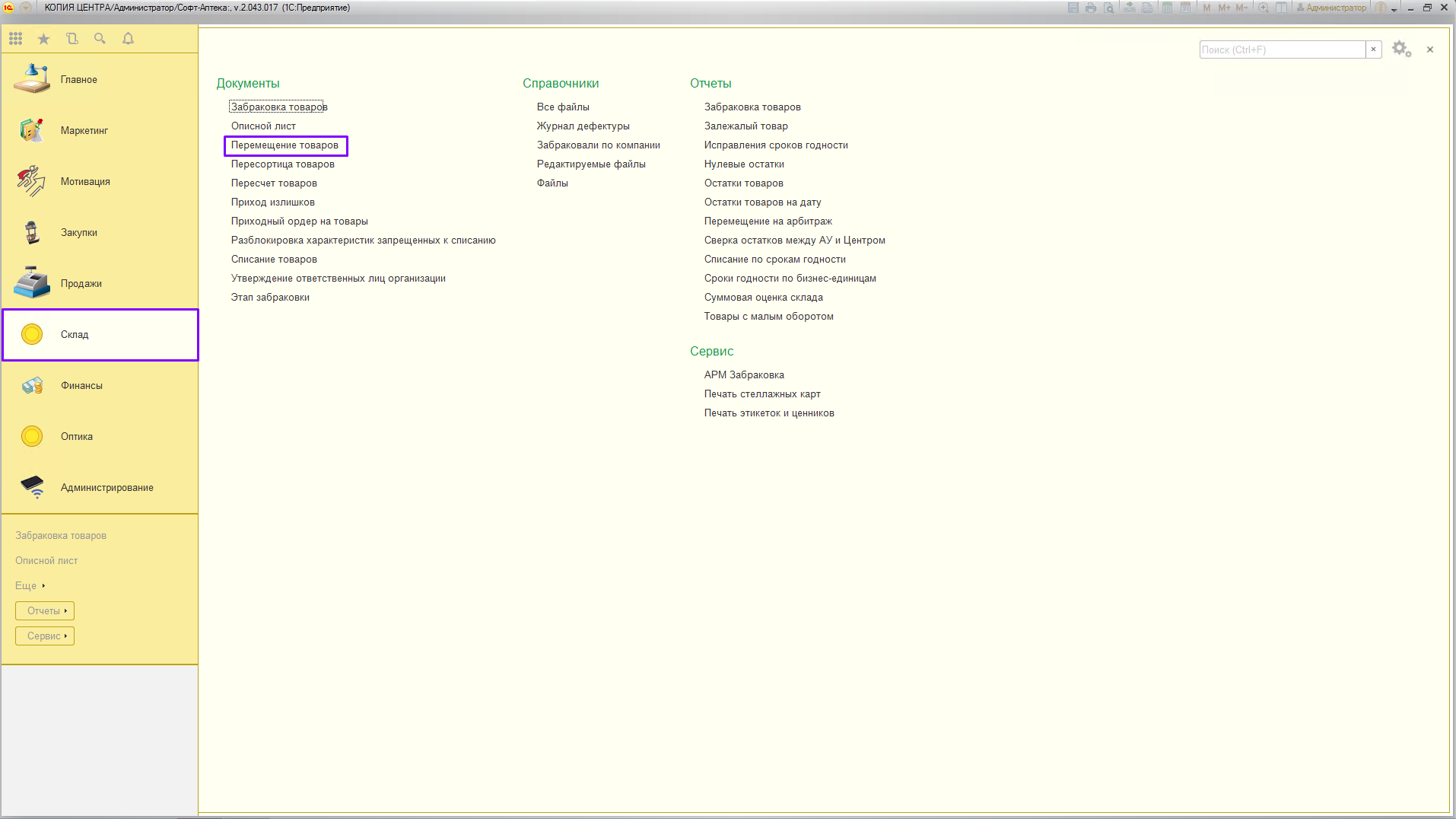 Во вкладке «Склад» выберите раздел «Перемещение товаров».