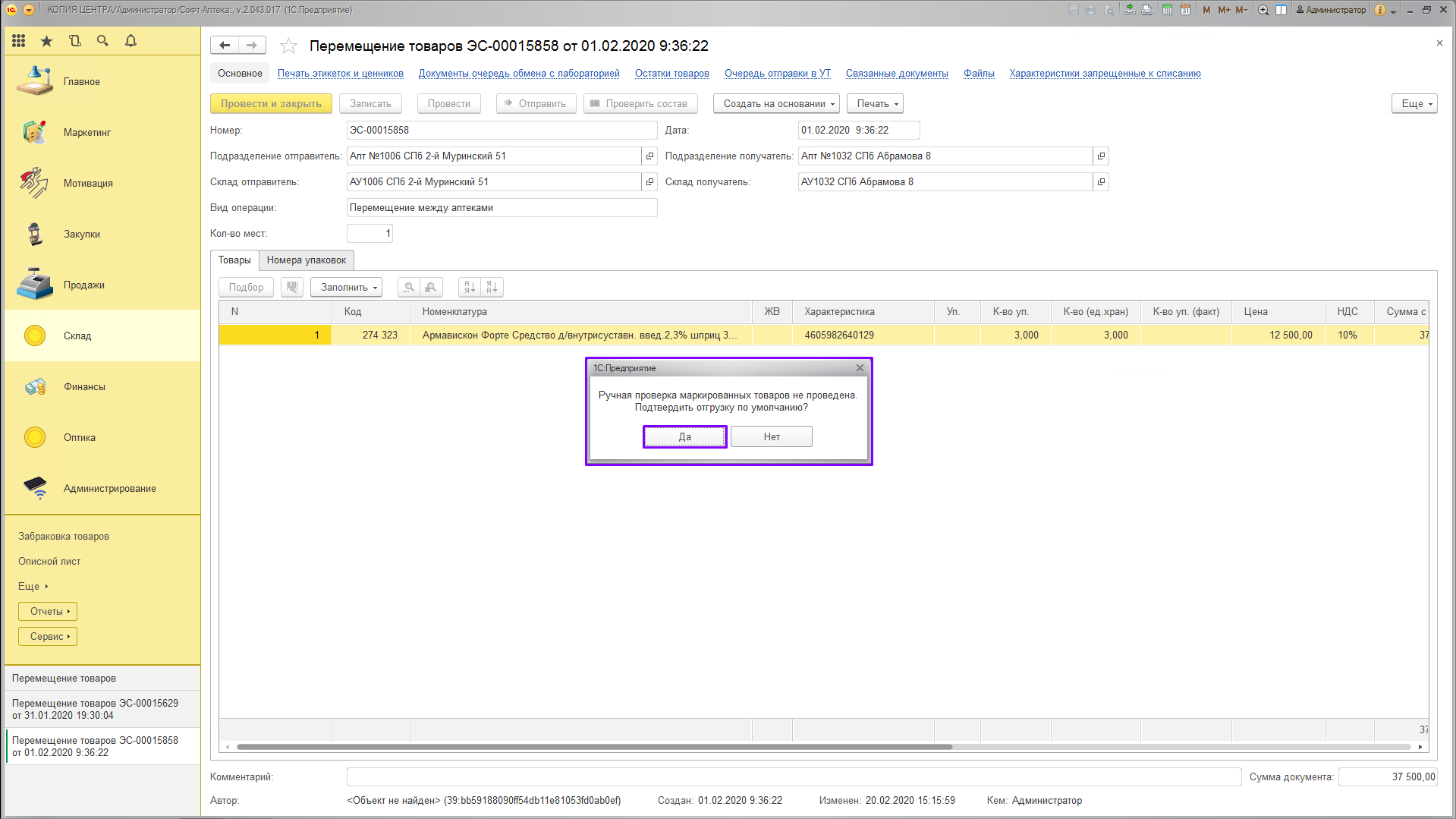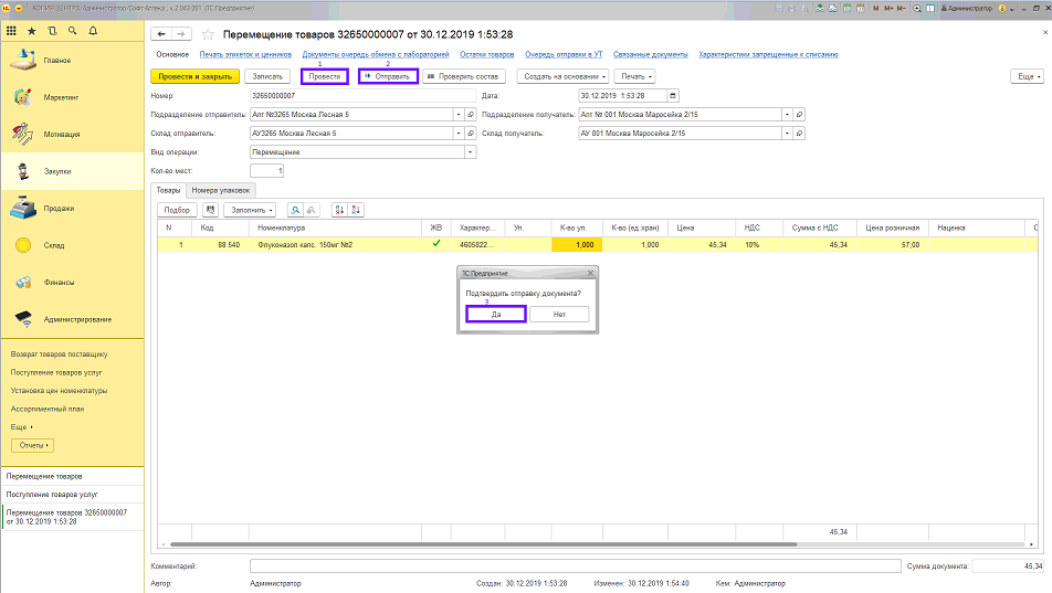 Для отправки документа перемещения в аптеку-получатель документ необходимо провести и отправить. Нажмите кнопку «Провести», затем кнопку «Отправить». Подтвердите отправку документа.