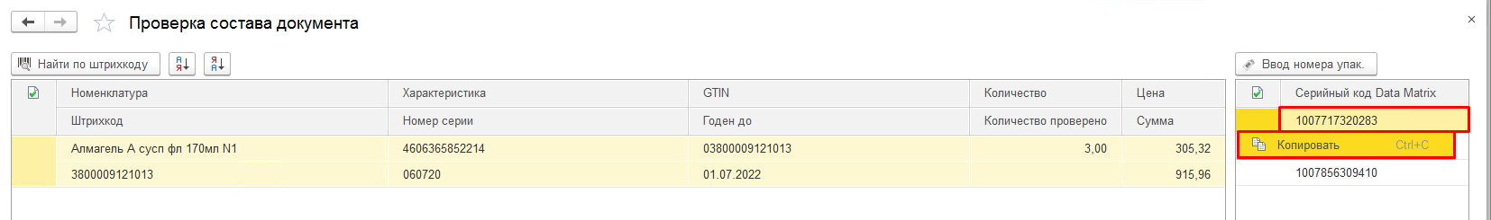 Скопируйте серийный номер упаковки из столбца «Серийный код Data Matrix». Для этого необходимо встать на требующийся серийный номер, нажать правую кнопку мыши и выбрать действие «Копировать» (так же можно воспользоваться комбинацией клавиш Ctrl+C).