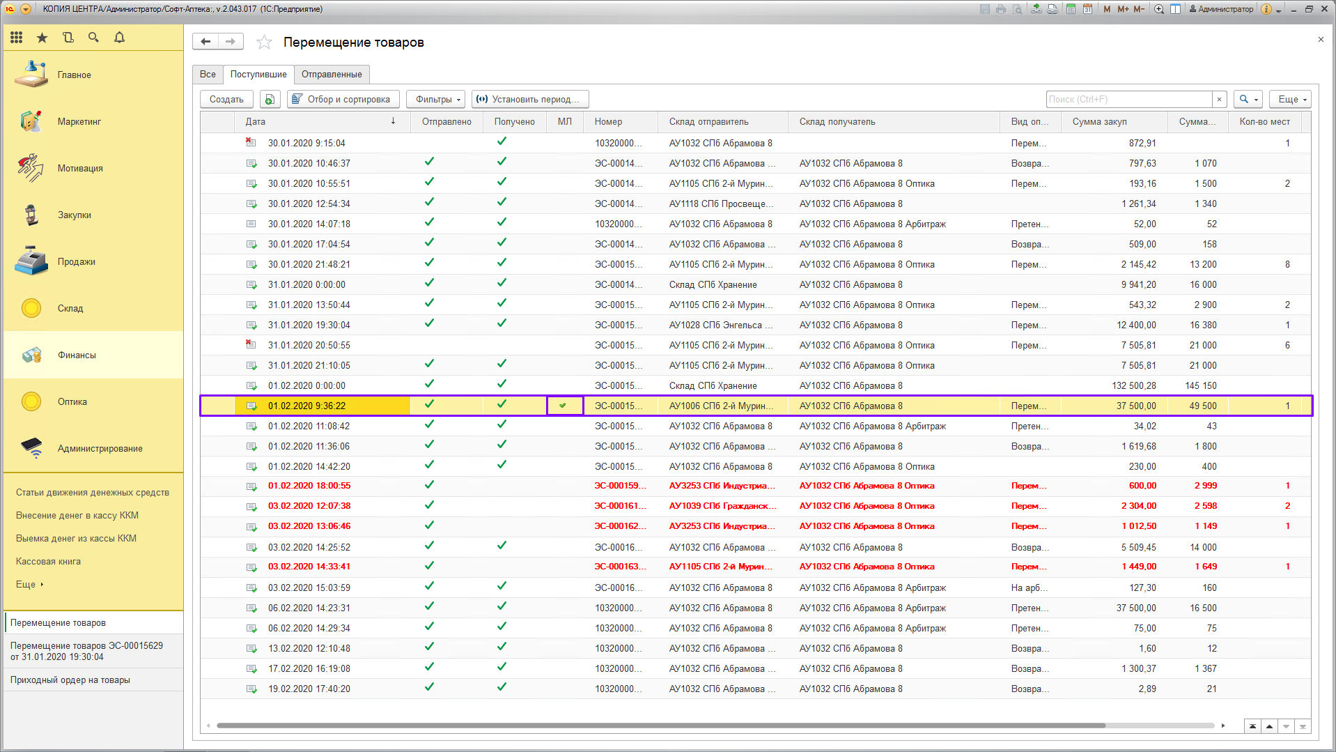 При наличии маркированного товара в документе будет дополнительно указан красный крест в столбце «МЛ». Документ перемещения в аптеке-получателя появится в течение 15 минут после отправки аптекой-отправителем.