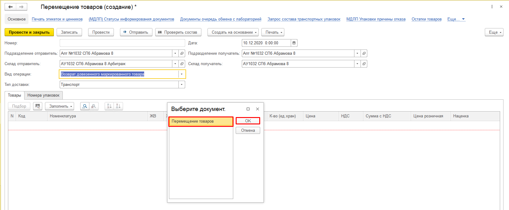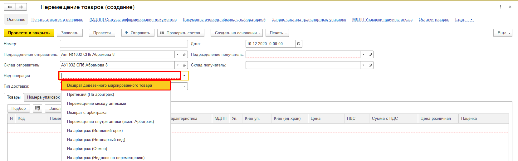 Перемещение по довезенному товару можно формировать только на основании перемещения на арбитраж с видом операции «Претензия (На арбитраж)» и с признаком «Недовоз» по маркированным позициям.
