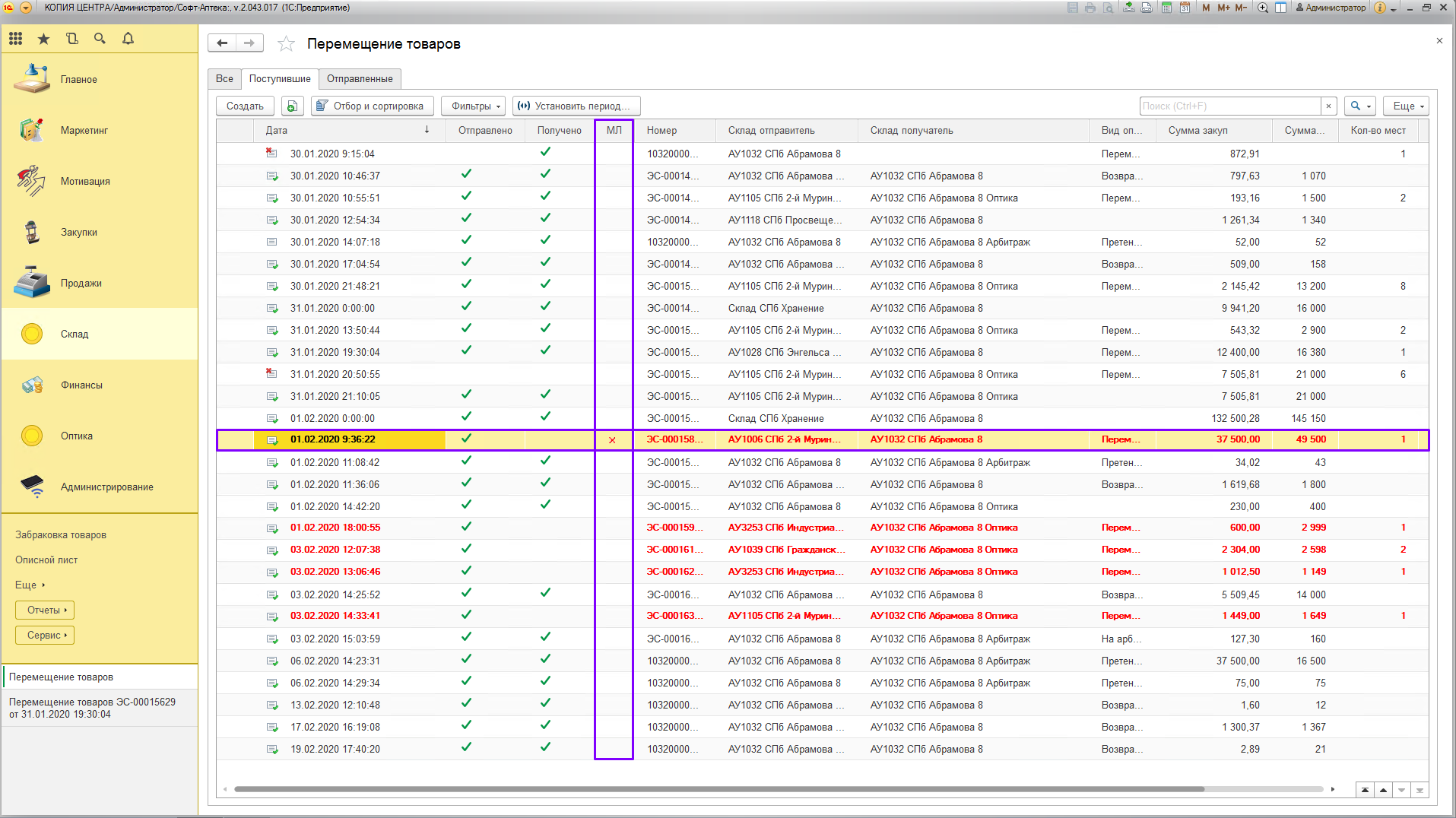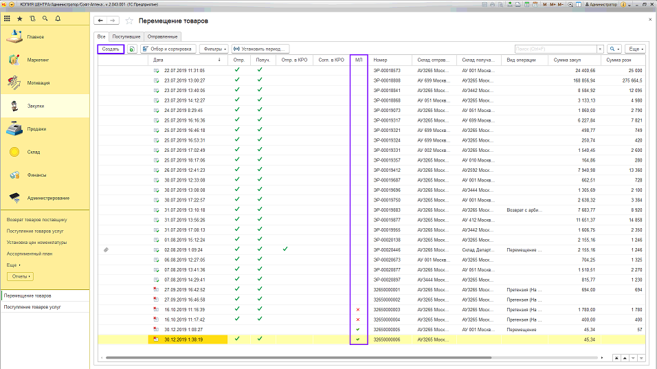 В рамках внедрения системы мониторинга движения лекарственных препаратов (МДЛП) в список документов перемещения была добавлена колонка "МЛ" (маркированное лекарство). В данной колонке отображается информация о наличии в документе маркированного товара и его статусе ("х"- маркированный товар не отсканирован, "v" - маркированный товар отсканирован).