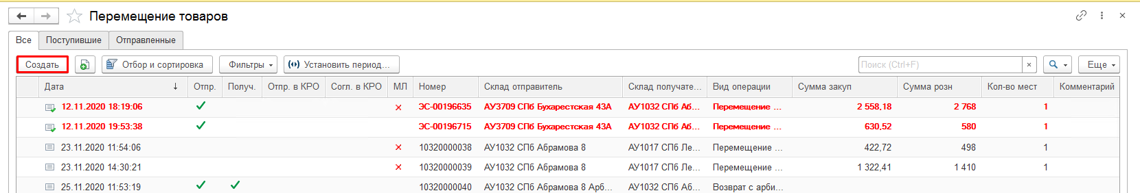 ВАЖНО! Перемещения создаются только в рамках одного юридического лица.