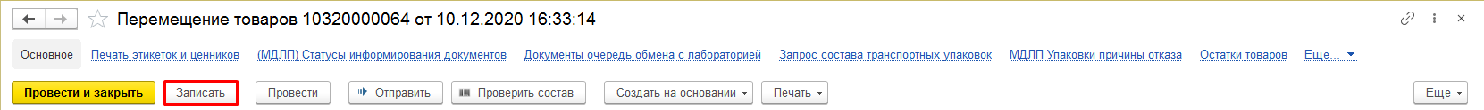 После заполнения шапки документа нажмите кнопку «Записать» для подтверждения последующего резервирования перемещаемого товара.