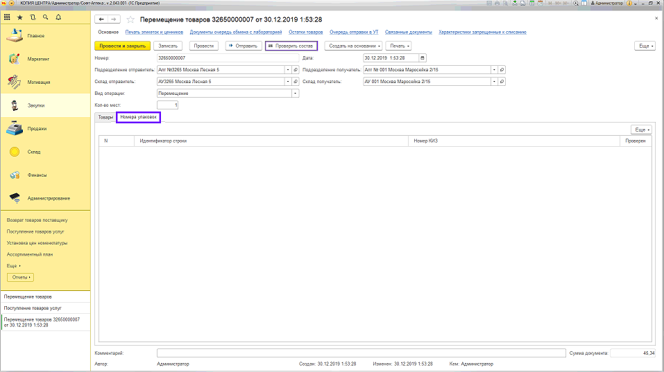 В данный момент табличная часть пуста, т.к. в рамках создаваемого перемещения не были отсканированы DataMatrix коды упаковок к перемещению. Для добавления упаковок нажмите кнопку "Проверить состав".