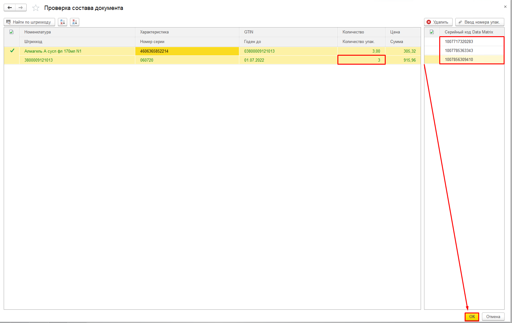 Когда все упаковки будут отсканированы строка «Количество» будет равна строке «Количество проверено».