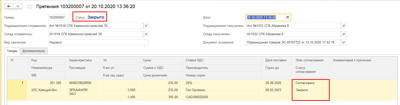 После того, как претензия будет обработана комиссией, документ вернется в Софт-аптеку в статусе «Закрыто». Каждая из строк претензии также будет закрыта, а в колонке «Этап согласование» будет отражено решение по каждой из позиций в документе.