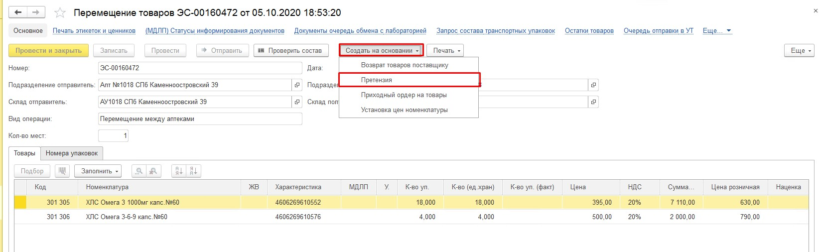 - Создание претензии на основании документа перемещения из другой аптеки.