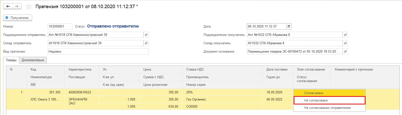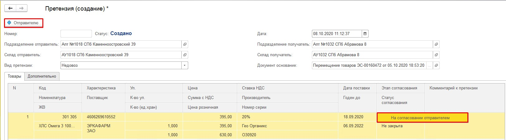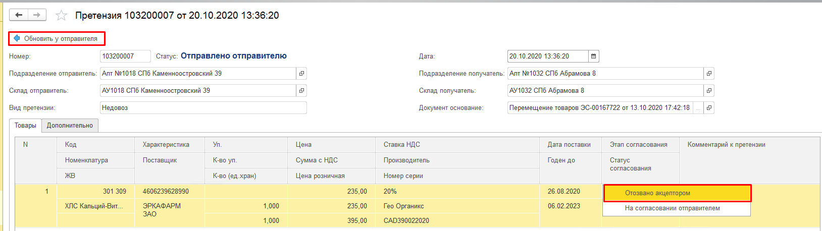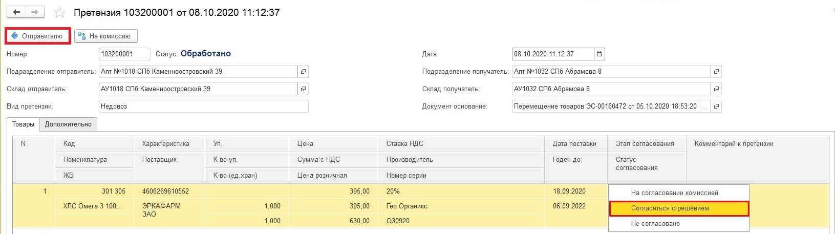 «На согласовании отправителем» - документ отправлен на согласование в аптеку-донор. Строки претензии по товарам на данном этапе не закрыты, товар недоступен для возврата на основной склад.