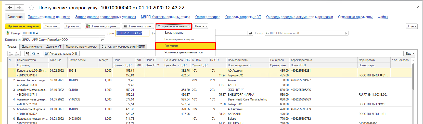 2. Создание претензии на основании документа поступления (по внутренней реализации от другой аптеки).
