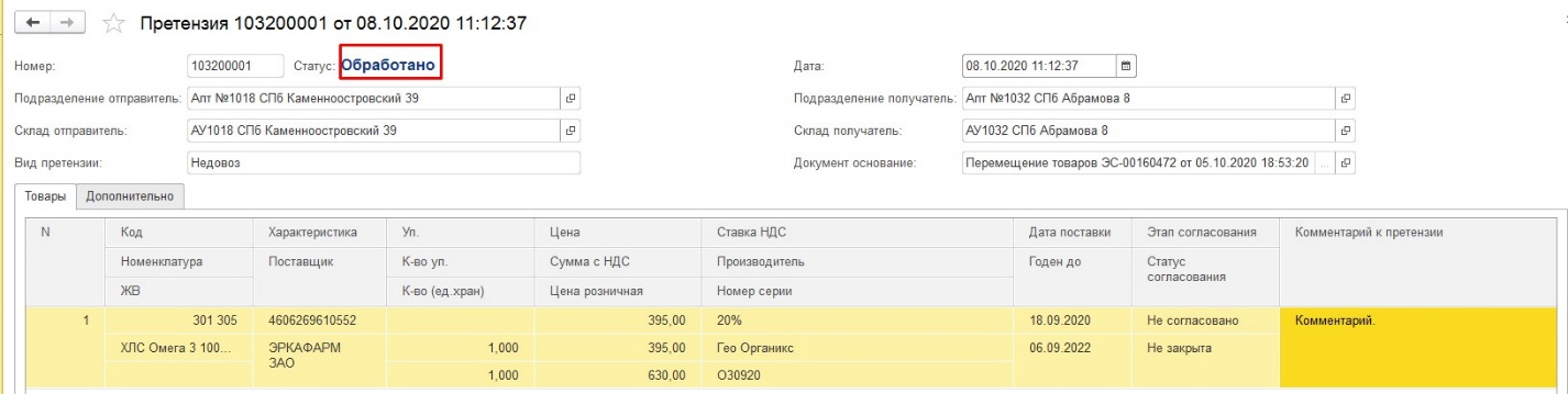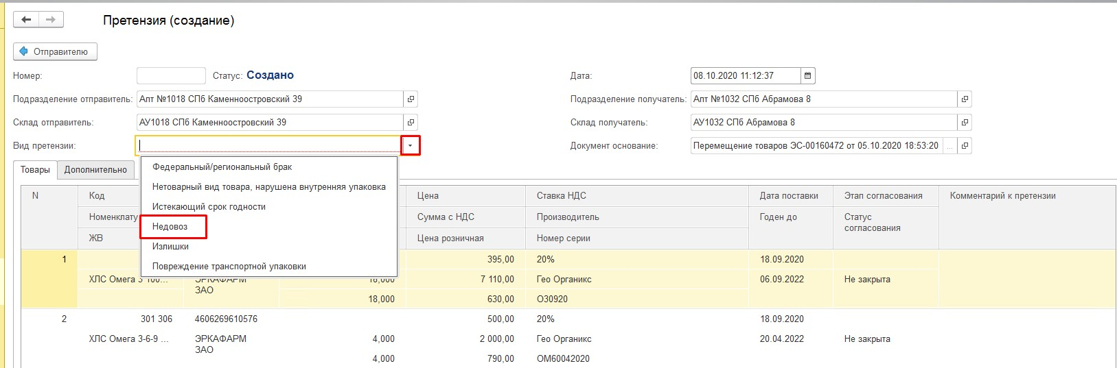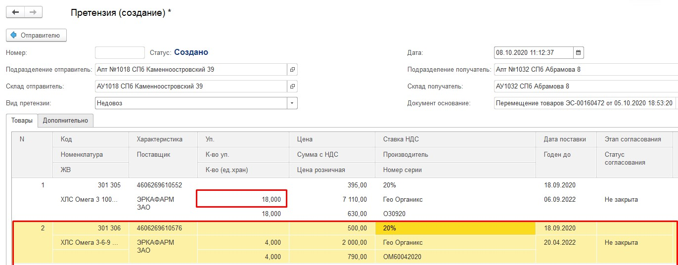 Допускается создание нескольких документов претензии на основании одного документа перемещения/поступления (например, одна упаковка была недовезена, еще одна помята).