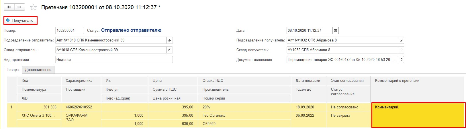 При необходимости, внесите или добавьте комментарий в столбце «Комментарий к претензии». Нажмите кнопку «Получателю».