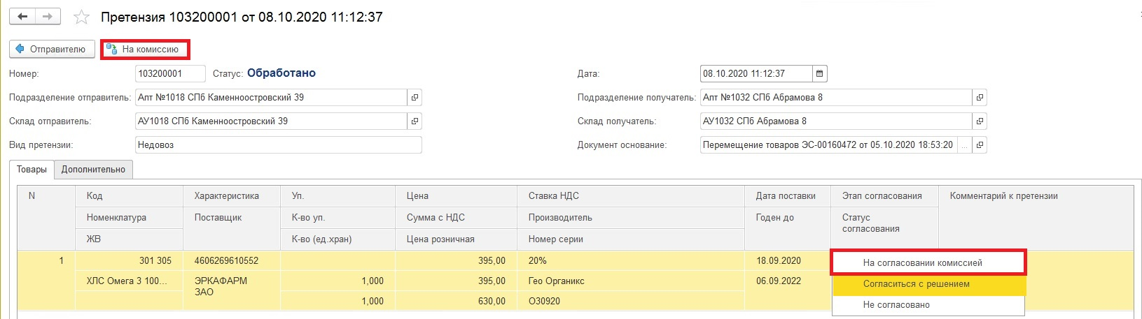«На согласовании комиссией» - претензия была отправлена на согласование комиссии. Строка претензии по товару на данном этапе не закрыта, товар недоступен для переноса на основной склад.