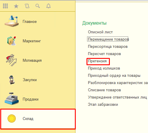 Для обработки претензии перейдите в меню «Склад» и выберите пункт «Претензия» раздела «Документы».