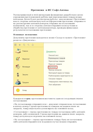 Рассматриваемый в этой инструкции функционал разработан в целях упрощения претензионной работы при перемещениях товара между аптеками. Далее будет рассмотрена работа с документами «Претензия» как со стороны аптеки-получателя (оформление претензии, отправка ее на рассмотрение аптекой-донором, отправка на согласование комиссией), так и со стороны аптеки-отправителя (получение и обработка претензии от аптеки-акцептора, проверка финальных результатов согласования претензии).