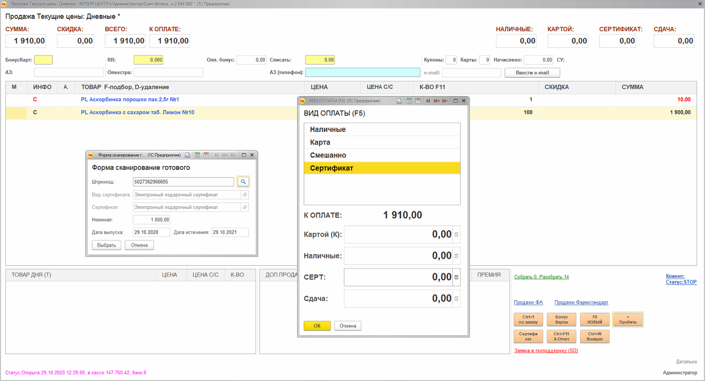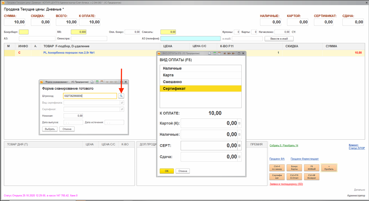 - Если сумма чека больше номинала сертификата, необходимо выбрать вид оплаты «Сертификат», откроется форма для сканирования ШК, после сканирования в центре проверяется статус сертификата, можно ли им оплатить, его номинал и сумма чека.