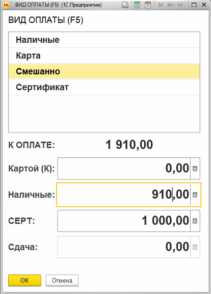2. Далее необходимо выбрать вид оплаты «Смешанно» и указать сумму в необходимый способ оплаты «Карта» или «Наличные».