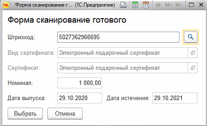 Продемонстрированный покупателем сертификат в виде карточки, распечатанный на слипе или сгенерированный в приложении (в виде штрихкода или его числового кода (13 цифр, qr-кода) необходимо отсканировать в поле «Штрихкод»: