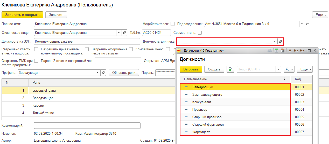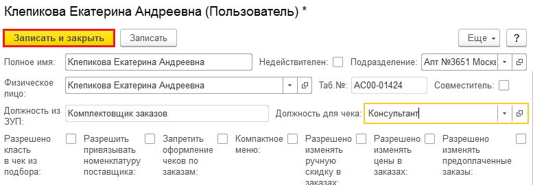 Откроется карточка сотрудника, где необходимо выбрать должность сотрудника в поле «Должность для чека».